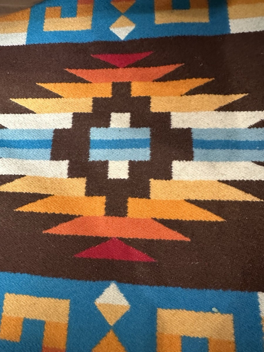COLOR: BROWN, ORANGE, RED, TURQUOISE, IVORY JUST TO MENTION A FEW BEAUTIFUL COLORS VERY VIBRANT AND WILL WAKE UP ANY SPOT ANYWHERE.