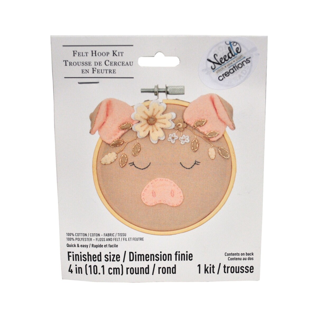 Needle Creations 4 Inch Felt Embroidery Hoop Kit Pig. Felt Hoop Kit. Kit includes everything to make the finished item. Quick and easy. 100 percent cotton. Contents: 1 Fabric panel, 3 Floss colors, 4 Felt colors, 2 Fabric pieces, 1 Bamboo embroidery hoop, 1 Needle, and Instructions. Finished Size: 4 Inch Diameter. CHK-NC-DMFLKT-PIG