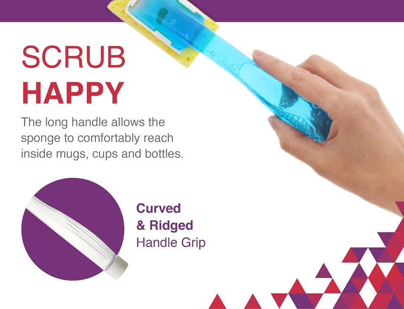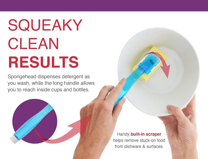 Squeaky Clean Results - Handy built-in scraper helps to remove stuck-on food from plates, pans, dishes and surfaces. The long handle allows you to reach nooks, crannies and the inside of water bottles and tumblers.