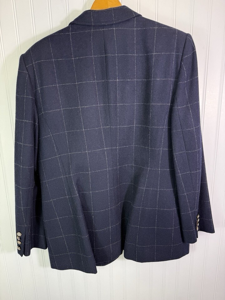 Lauren Ralph Lauren Green Label Vintage Equestrian Blazer for Horsehead Buttons and Navy Blue Windowpane plaid pattern. 100% Wool. Two button closure, four buttons at cuff. Structured shoulders. Women's size 14. Fully lined.