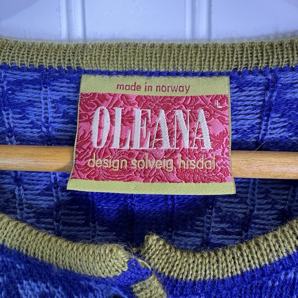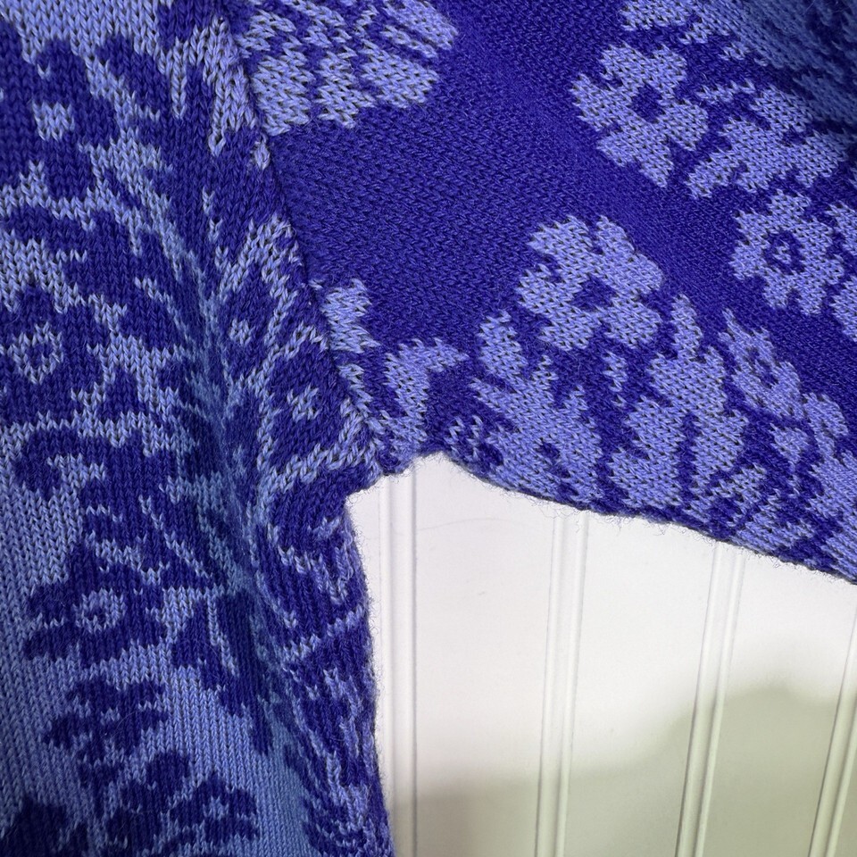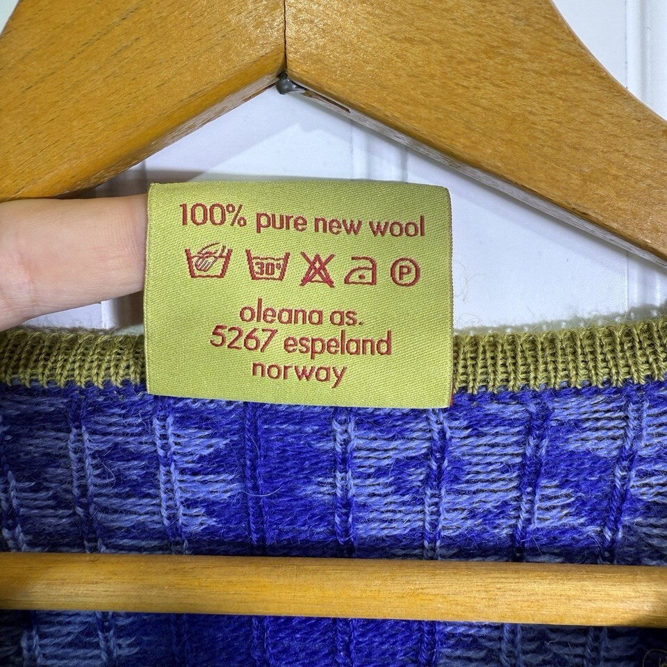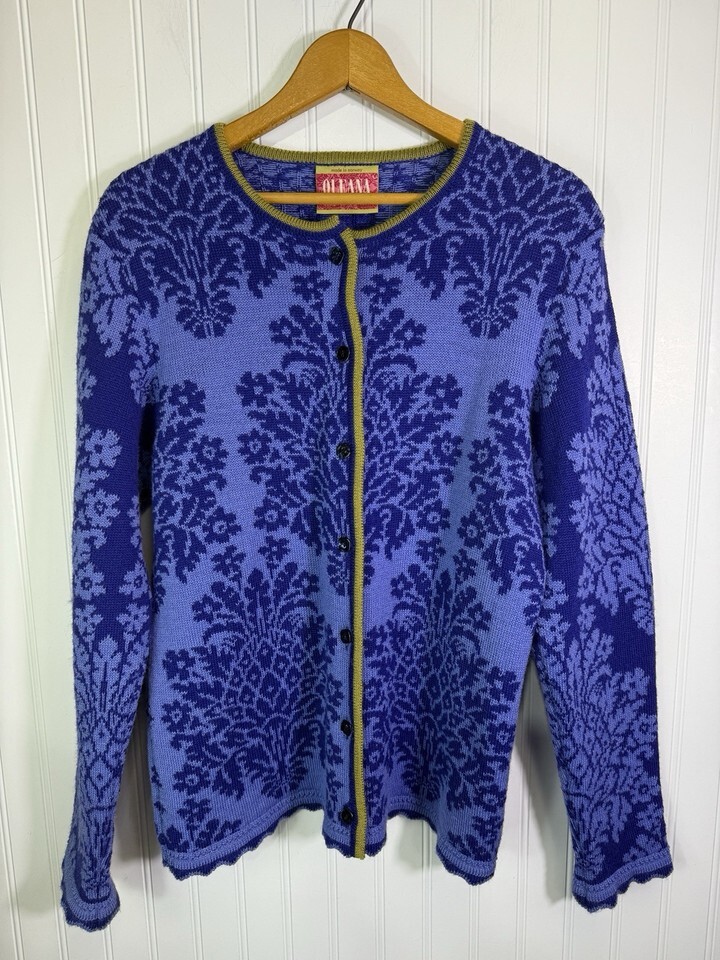 Oleana 100% Wool Cardigan made in Norway. Vibrant periwinkle blue and purple damask look floral pattern with scalloped edge at cuff and hem. Green accent edging and gorgeous blue mother of pearl/shell buttons.Very minimal piling. No holes or stained. Vibrant color. Well cared for. See pictures for details.