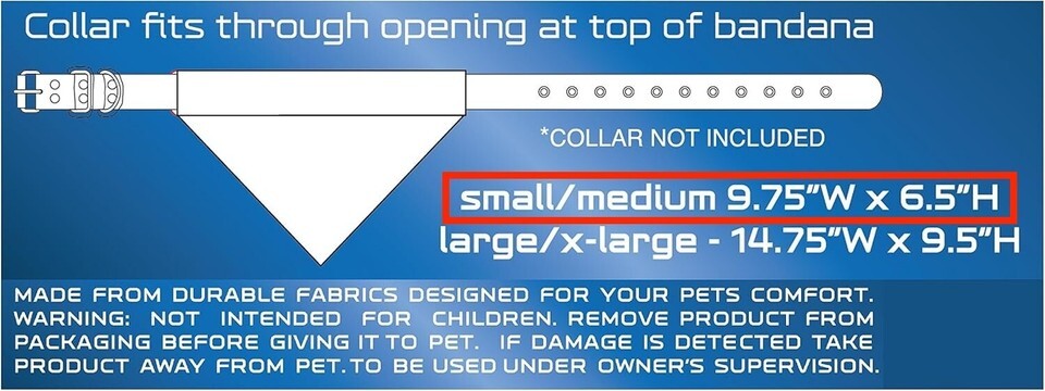 NCAA Reversible Bandanas Your pet will surely be able to show off his/her team spirit with this unique Pets First DUAL SIDED COLLEGE DOG BANDANA! It features a screen printed team logo and name on 1 side a embroidered team logo on the other side! Officially licensed and ready for game day! Comfortable 100% poly-cotton keeps it wrinkle free and easy to clean. Great for parties BBQs tailgating and even Halloween as a pet costume. SIZING USE: 2 SIZES: ? Small/Medium Bandana: 9.5 x 6.5. ? Large/X-Large Bandana: 14.5 x 9.5. Two available sizes will fit most dogs including small dogs medium dogs and large dogs. Please measure your dog before ordering to ensure you get the right fit and avoid any need for a return or exchange. Best fit if used with our matching COLLEGE DOG COLLAR! Features: NCAA Officially COLLEGE licensed. Features the TEAM LOGO and bright colors of your favorite COLLEGIATE TEAM! REVERSIBLE - 2 sided PET BANDANA you can rotate the design your PUPPY wants to wear! 1 Side is a MESH BANDANA with screen-printed LOGO 1 Side is Poly-cotton with a premium embroidered TEAM LOGO! BEST QUALITY DOG Made of a durable mesh poly-cotton fabric making it the ideal bandanas for dogs even for the most energetic puppies. The #1 Dog Bandanas for dogs both large and small GAME DAY - This awesome SPORTY BANDANA is an adorable way to include your pet during game day. It s also great for tailgating barbeques Halloween and other parties!