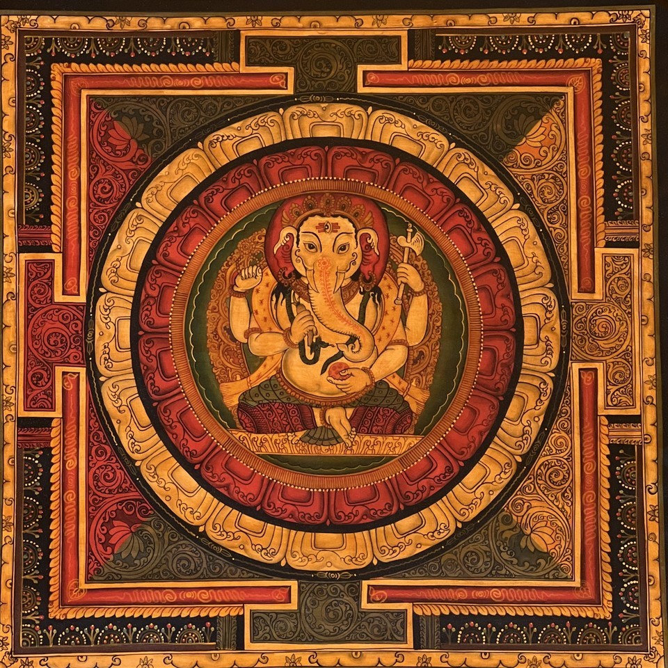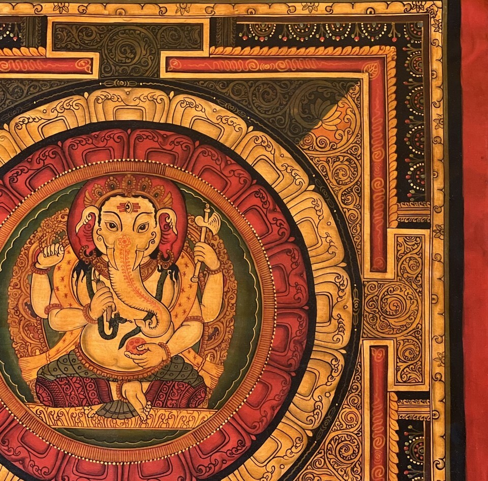 SRI YANTRA GANESH MANDALA ORIGINAL THANGKA PAINTING / OIL VARNISH HINDU WALL ART
