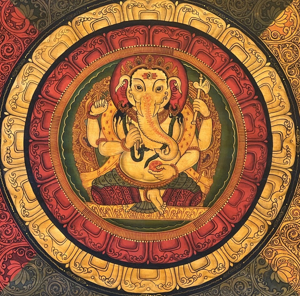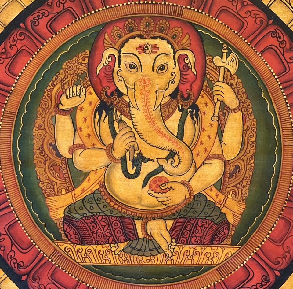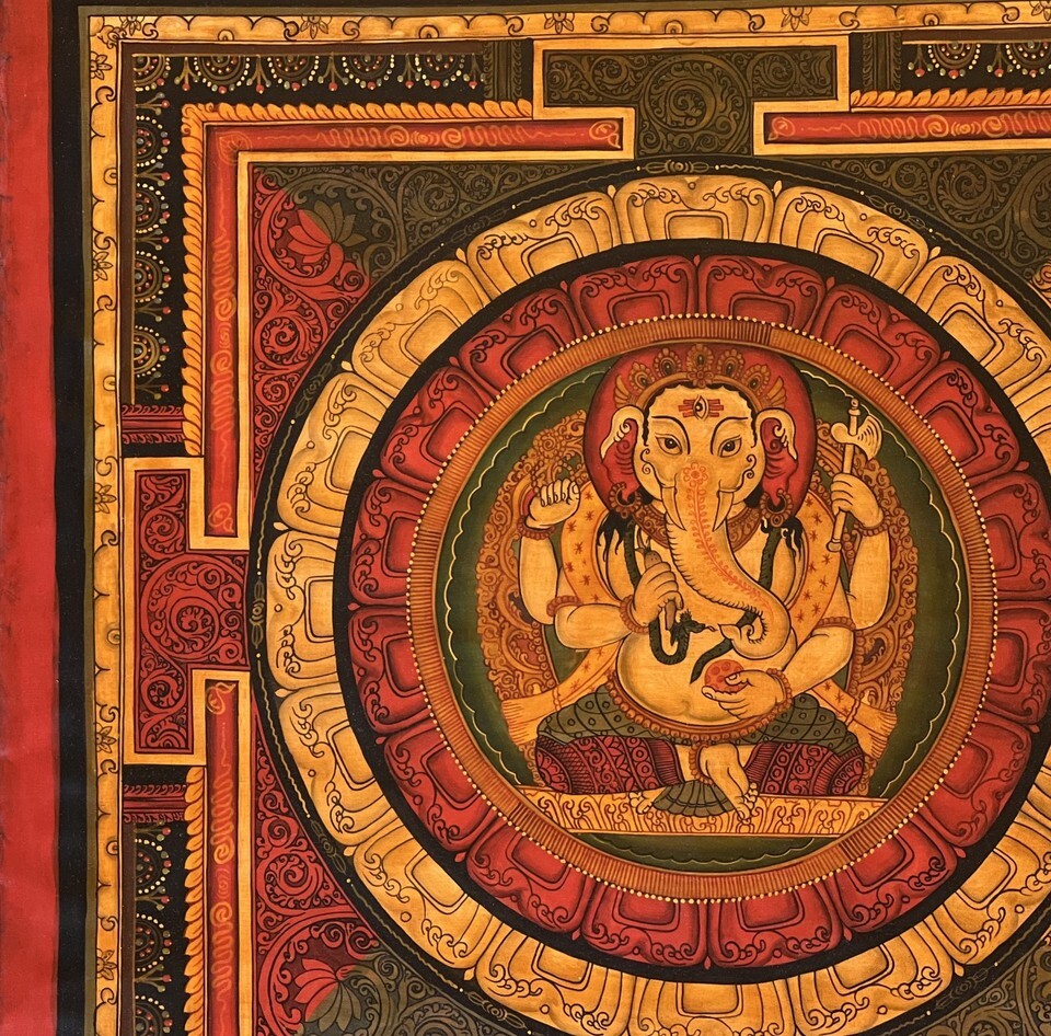 Hand-Painted Ganesha Inside Shri Yantra ? Traditional Newari Thangka Art