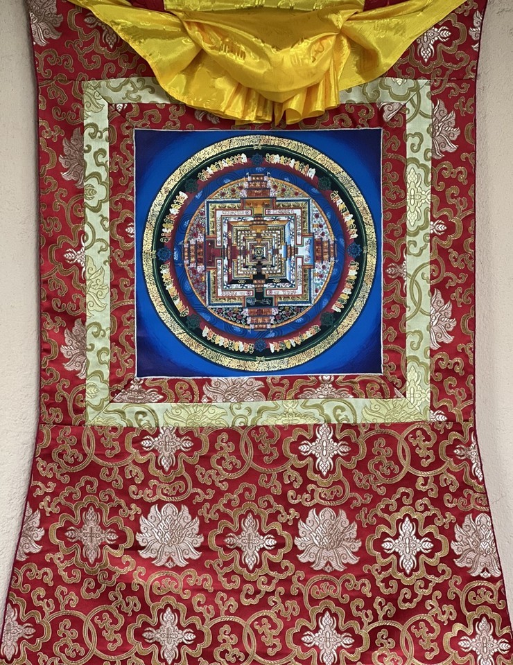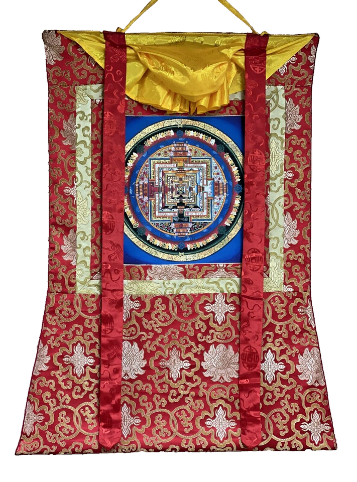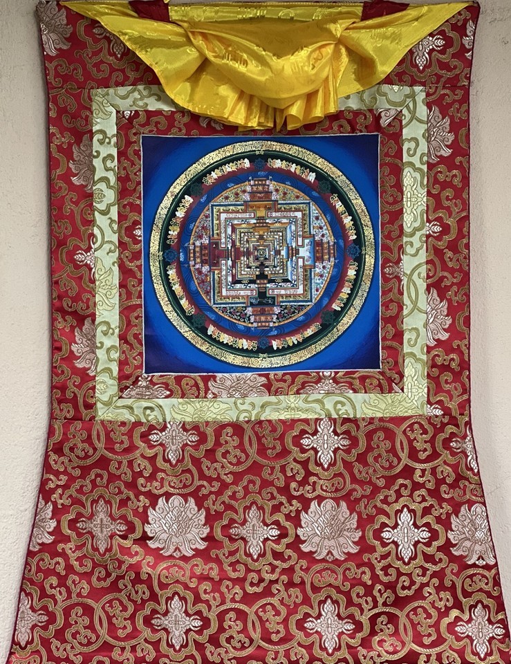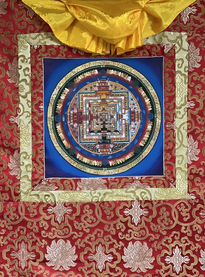 HAND-PAINTED KALACHAKRA MANDALA TIBETAN THANGKA/THANKA PAINTING WITH SILK BORDER