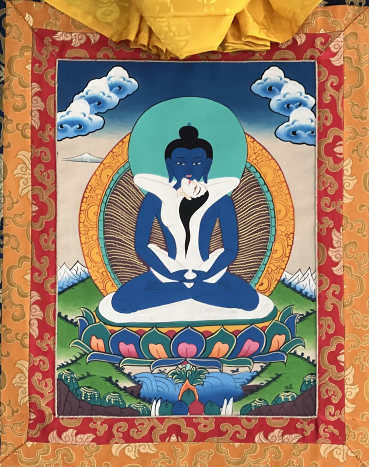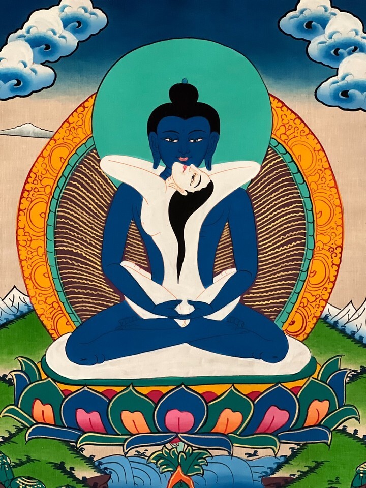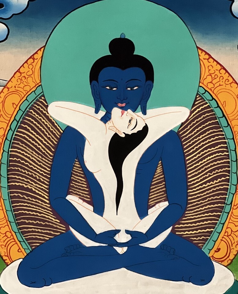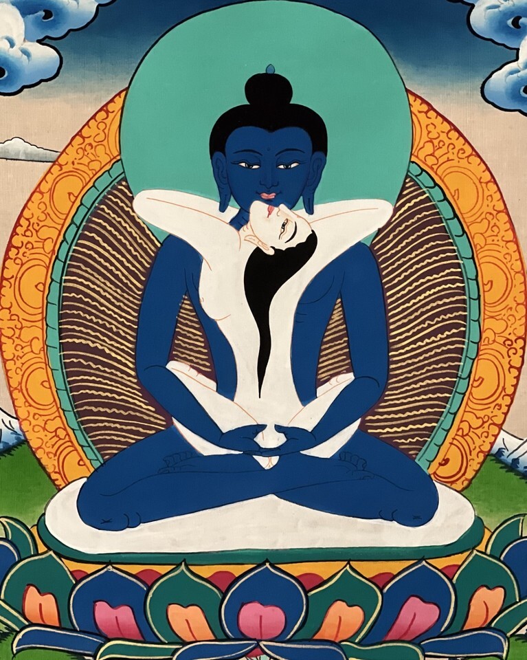 In this thangka, the divine union unfolds as Buddha Shakti embraces his consort Samantabhadri in the sacred Yab-Yum posture. Adorned with a rich blue hue, Buddha Shakti sits in a 'vajra' posture, his naked form symbolizing the original nature of the mind. With hands gracefully placed on his lap in a meditative gesture, Buddha Shakti becomes a powerful representation of the unity between awareness and compassion.