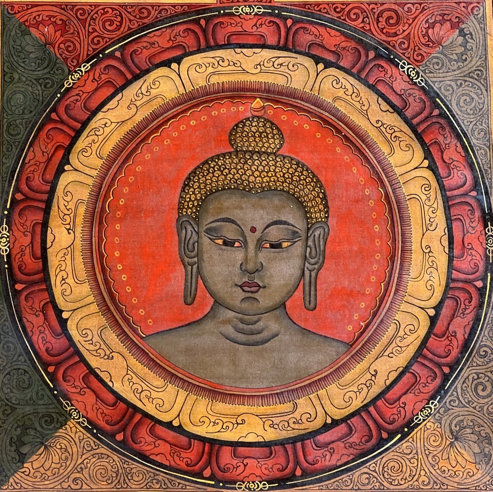 This is an original hand-painted Medicine Buddha (Bhaishajyaguru) Thangka, beautifully set within the sacred Sri Yantra design. Created in the traditional Newari Paubha style, the painting is done on fine handmade cotton canvas, using rich natural pigments and gold highlights.