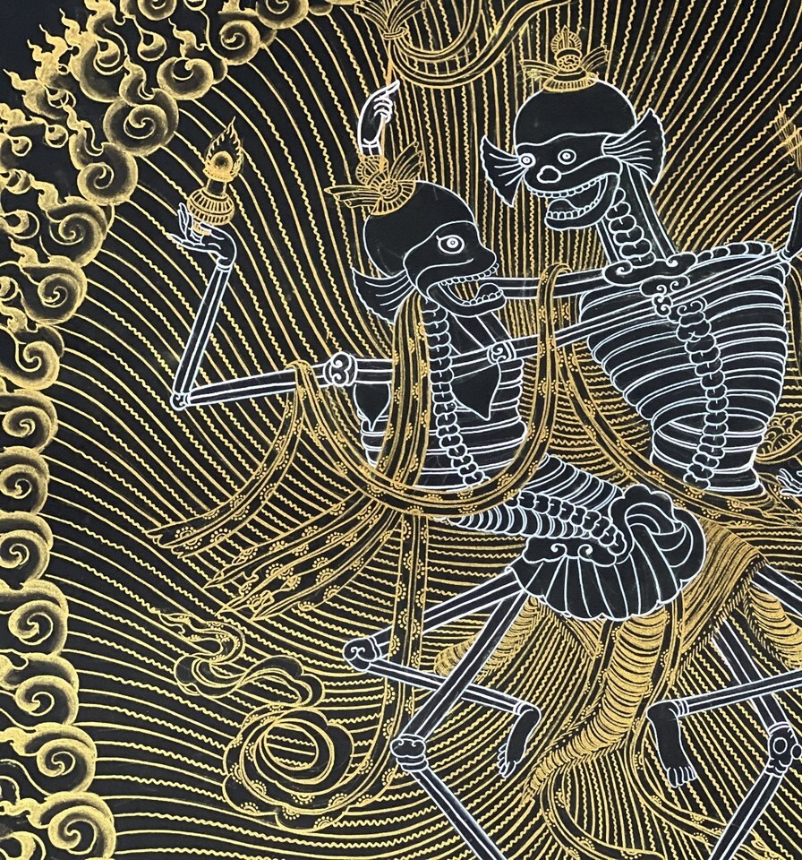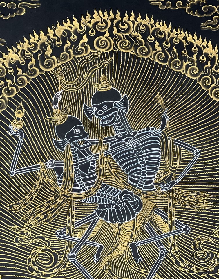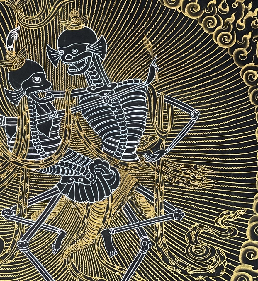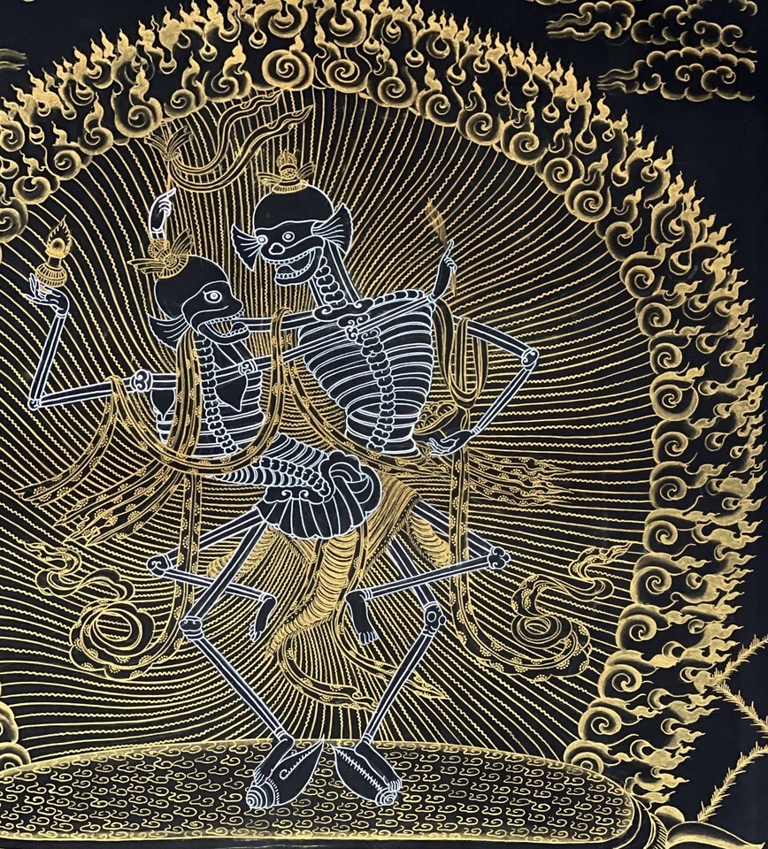 Citipati, a happy couple is also called the ?Lord and Lady of the Charnel Grounds? and they are the principal Dharma protectors that are associated with the tantric systems of Vajrayogini. Meditation practices on the charnel grounds were a common tantric practice with the Indian Mahasiddhas, especially connected to the Heruka Chakrasamvara/Yogini transmission lineage. These above-ground sites were places that were covered with human flesh, bones, and blood, where corpses were brought to be cremated -if one could afford the wood- but more often they were left to be ripped apart and eaten by wild animals, such as vultures. These frightening places were far from town where no one usually went, except for these yogis who came to contemplate and meditate on the impermanence of all phenomena.