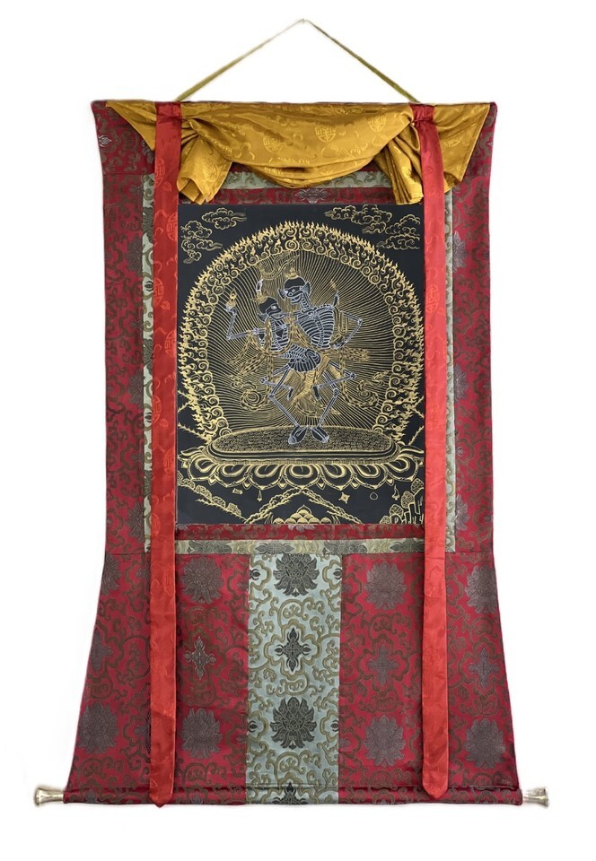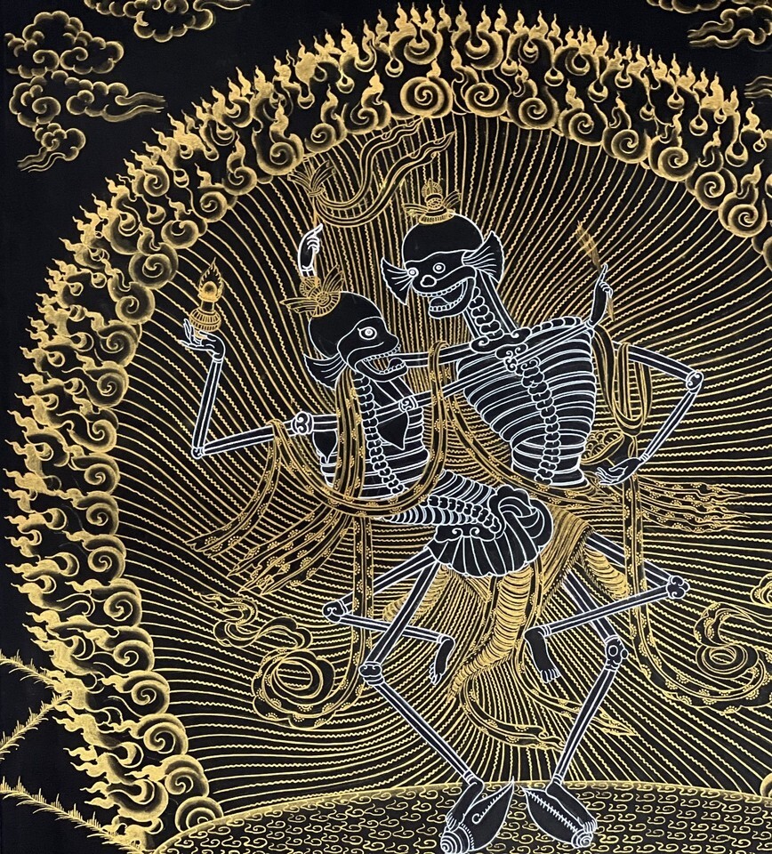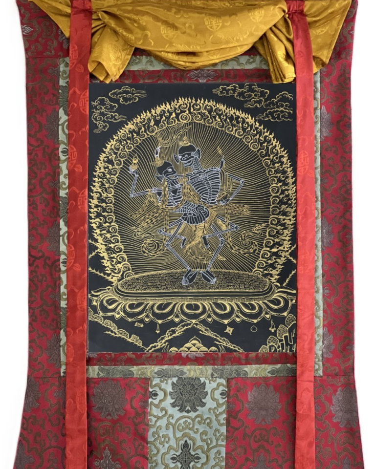 CITIPATI/HAPPY COUPLE ORIGINAL TIBETAN THANGKA PAINTING WITH HIGH SILK BORDER