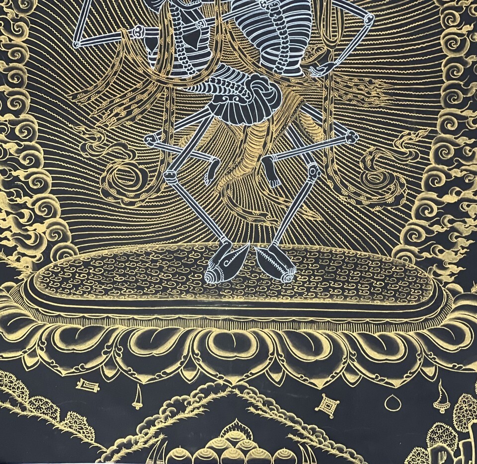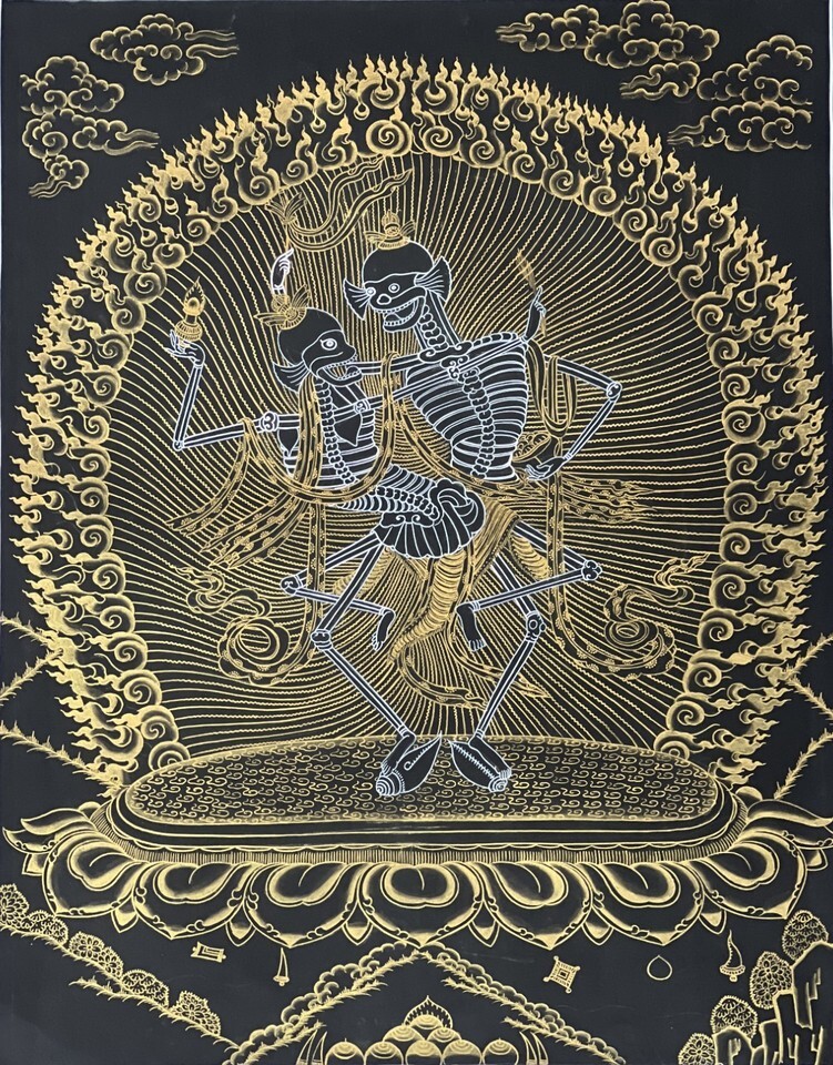 This is an old oil varnished hand-painted Citipati Tibetan Thangka, one of the finest Asian art form, that is written on a canvas using gold and natural colors.