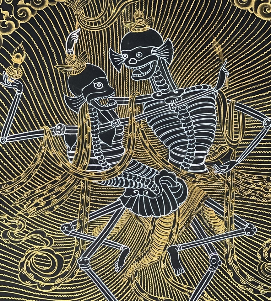 These happy-looking skeletons are also a common feature at the Cham Lama dances that are held by the monasteries at certain Buddhist festivals. These events are livelily costumed and masked dances performed by monks and accompanied by music played on traditional Tibetan instruments.