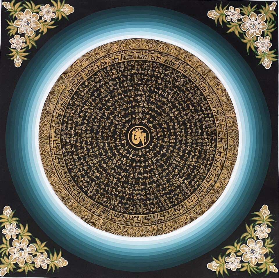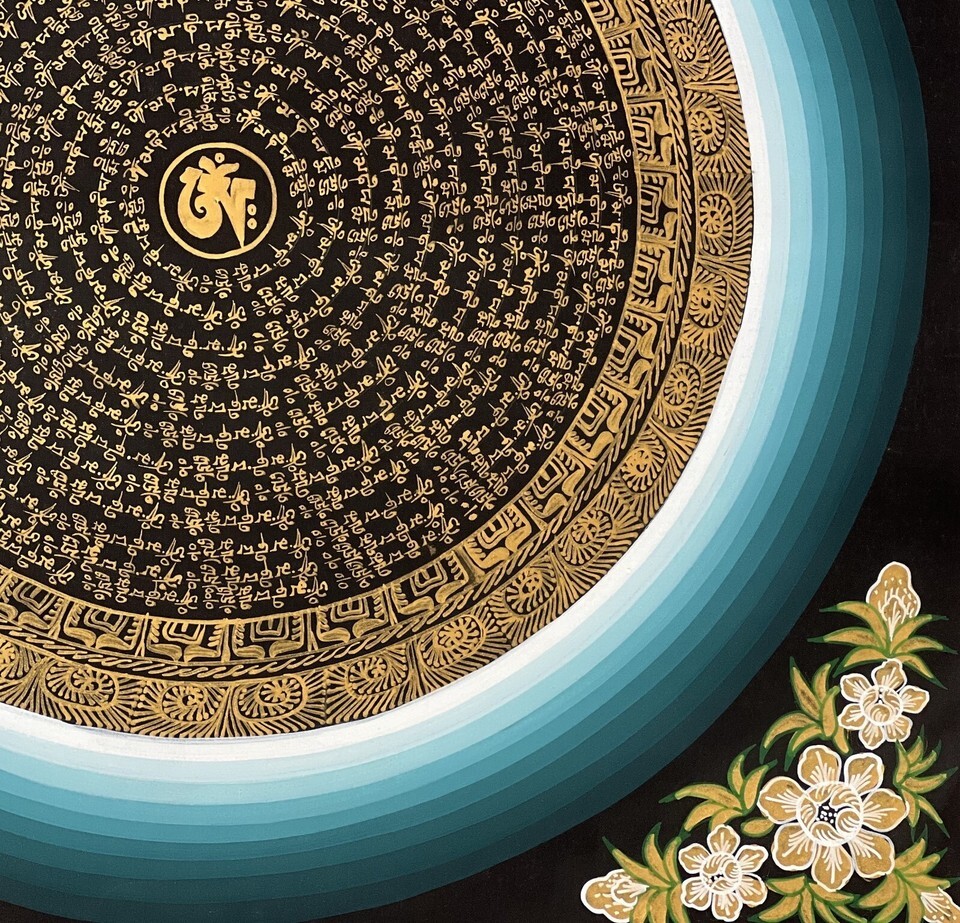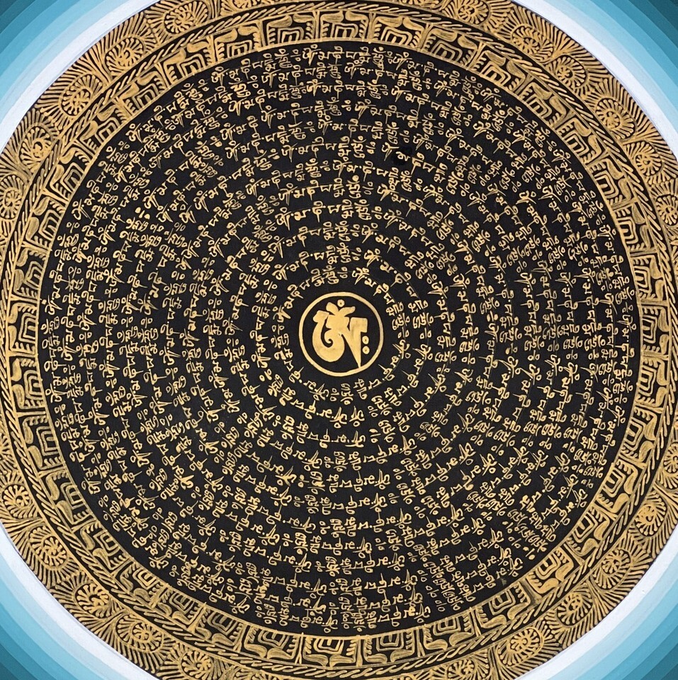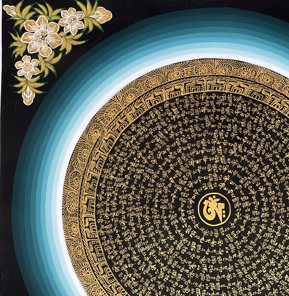 This is an original hand painted Om Mani Padme Hum Mantra Mandala Tibetan Thangka painting. This thangka painting is a sacred and intricate piece of Tibetan Buddhist art that beautifully combines spiritual symbolism with artistic craftsmanship. This exquisite thangka features a vibrant and meticulously detailed mandala at its center, adorned with the powerful mantra "Om Mani Padme Hum" written in ancient Tibetan script.