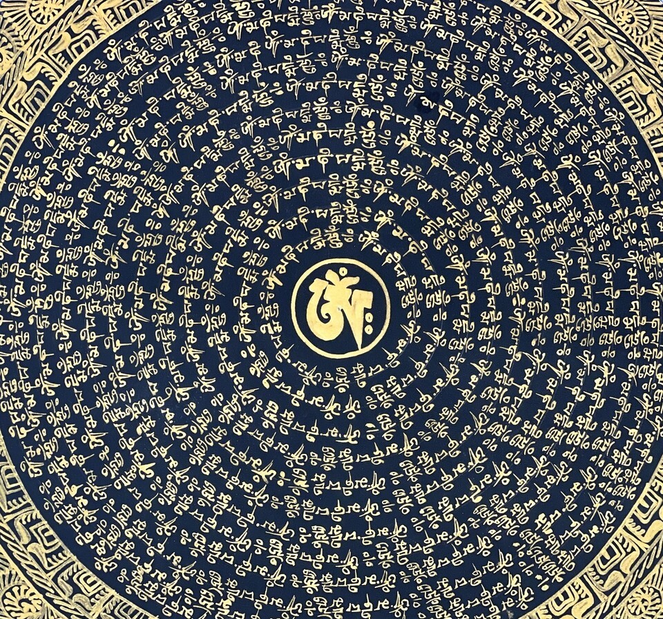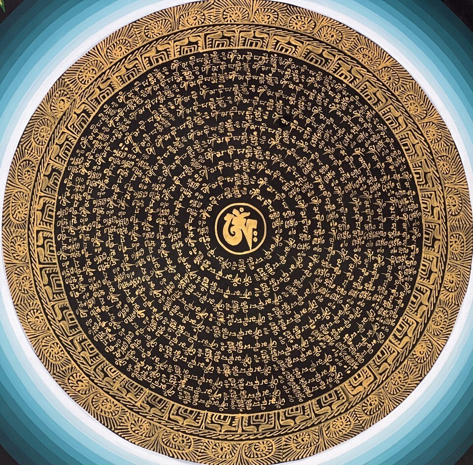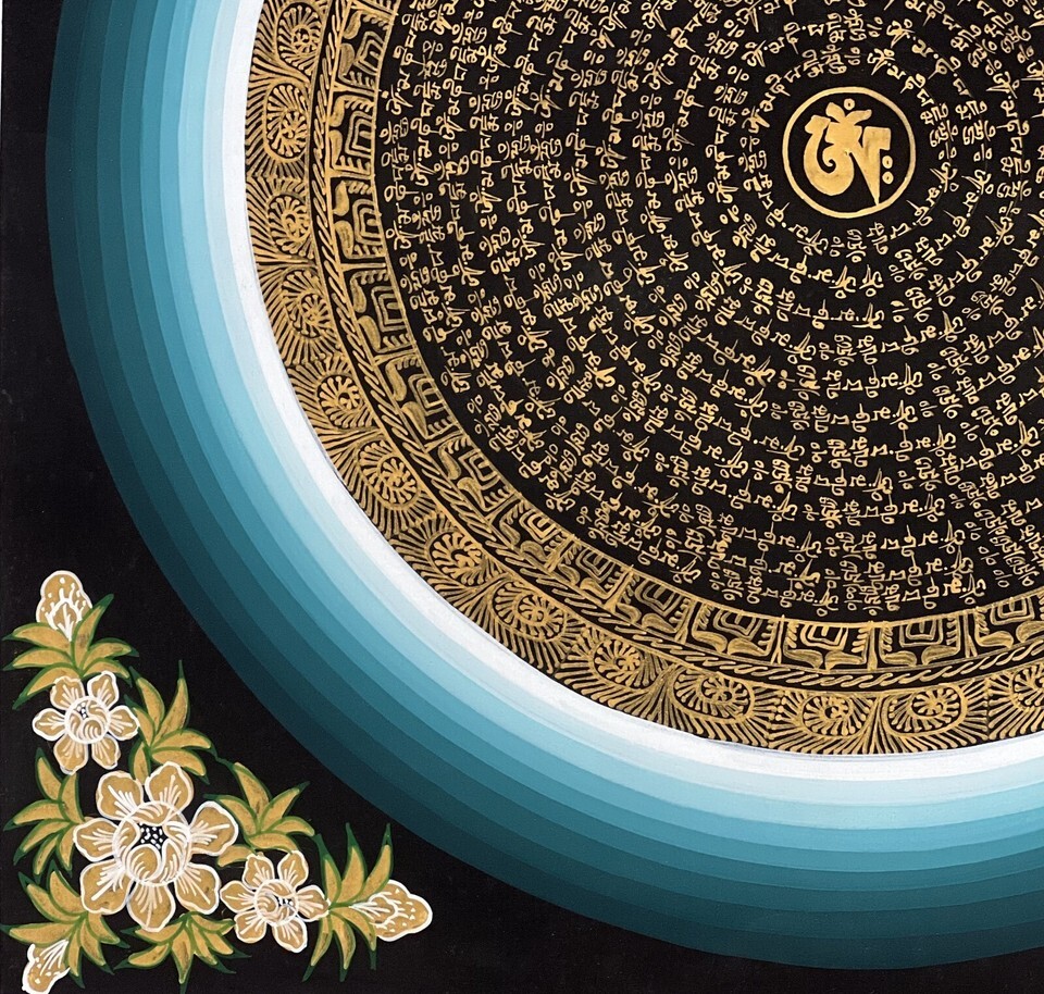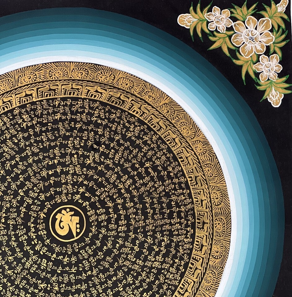This is an original hand painted Om Mani Padme Hum Mantra Mandala Tibetan Thangka painting. This thangka painting is a sacred and intricate piece of Tibetan Buddhist art that beautifully combines spiritual symbolism with artistic craftsmanship. This exquisite thangka features a vibrant and meticulously detailed mandala at its center, adorned with the powerful mantra "Om Mani Padme Hum" written in ancient Tibetan script.