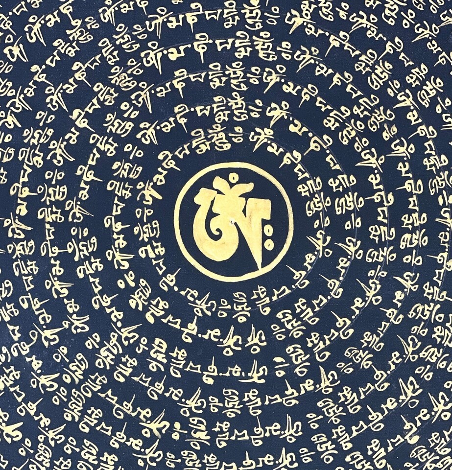 The mantra, considered one of the most potent in Tibetan Buddhism, is a prayer for compassion, wisdom, and enlightenment. Surrounding the mantra are intricate patterns, symbols, and depictions of deities, each carrying deep spiritual significance.