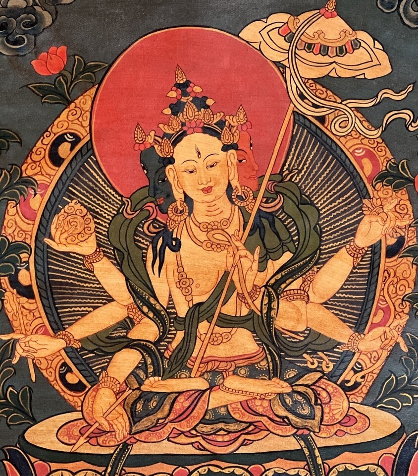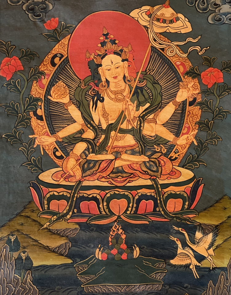 The multifaceted symbolism is reflected in Sitatapatra's depiction with multiple arms, each gracefully holding symbolic objects that carry spiritual significance. This goddess is revered for her extraordinary power to dispel diseases, negative energies, and obstacles that may impede one's spiritual journey. Devotees turn to Sitatapatra, praying for her protective guidance and the removal of hindrances in their lives.