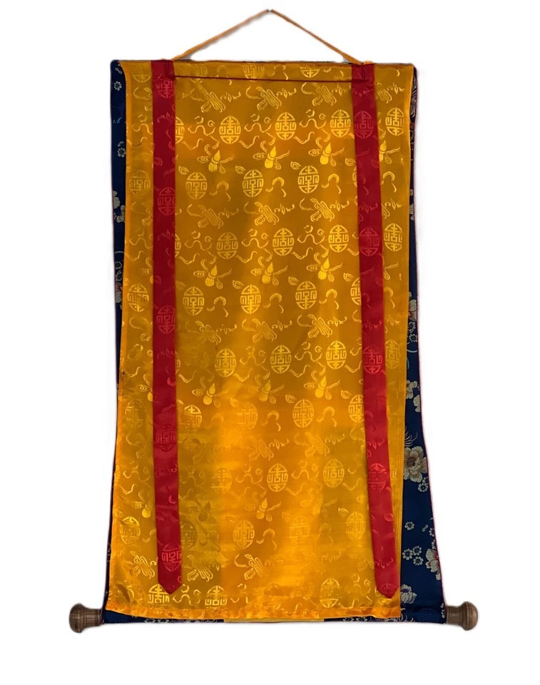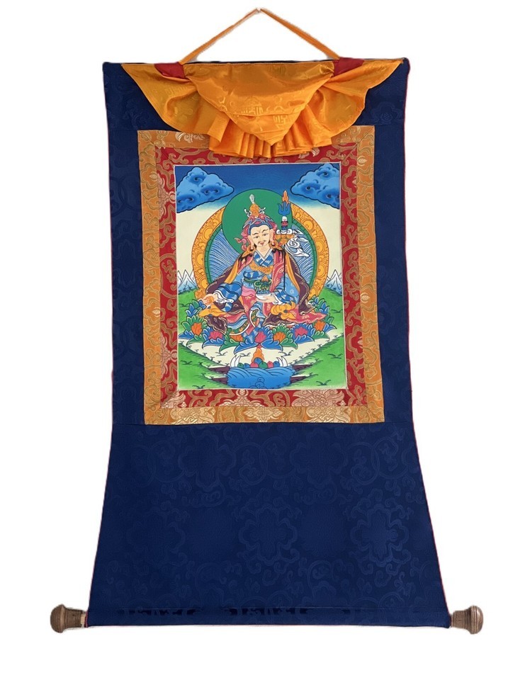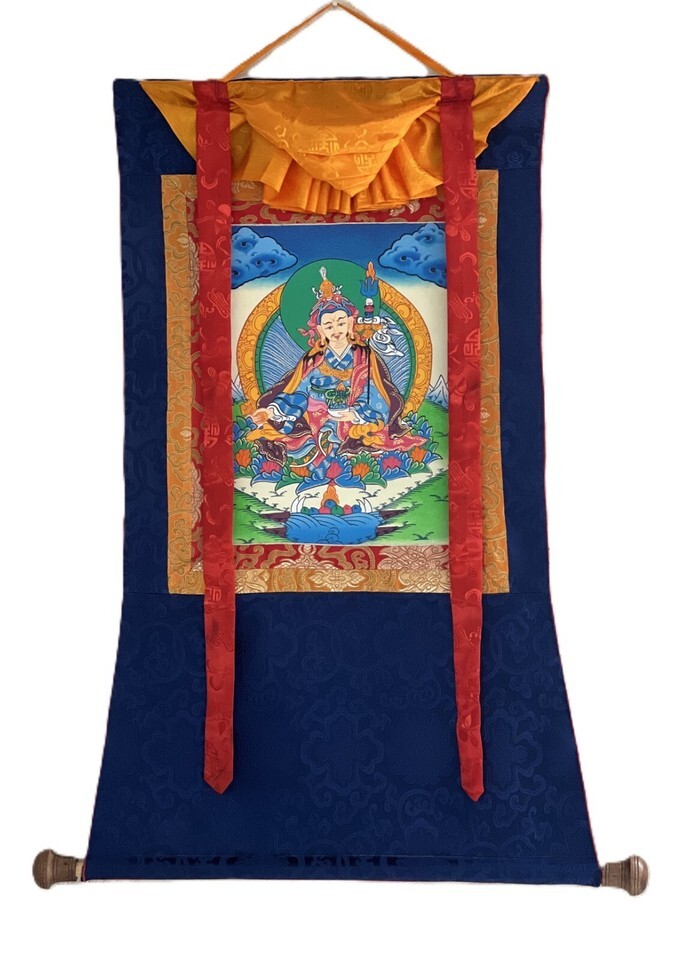 This Tibetan Thangka Painting depicts Guru Rinpoche/Padmasambhava and is adorned with traditional silk fabric. In the 8th century, Buddhism was introduced to Tibet by the Indian master Santaraksita. He, along with King Trisong Detsen, began the construction of the first monastery. However, they faced resistance from local spirits that impeded their progress. The King invited Guru Padmasambhava, renowned for controlling physical reality, to help pacify the spirits.