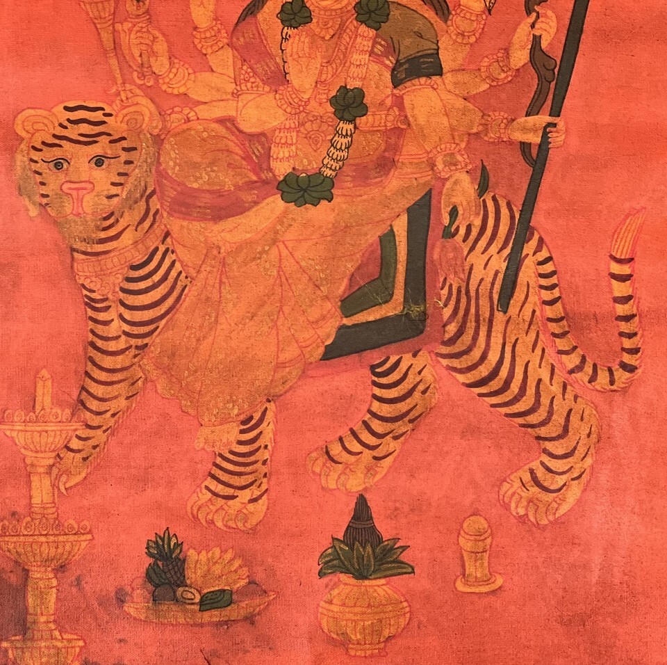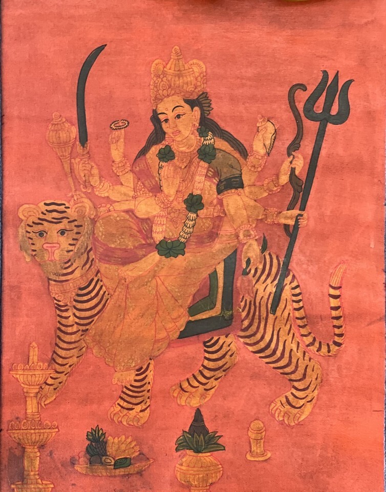 GODDESS DURGA HAND-PAINTED HINDU ART THANGKA OIL VARNISHED WITH SILK BROCADE