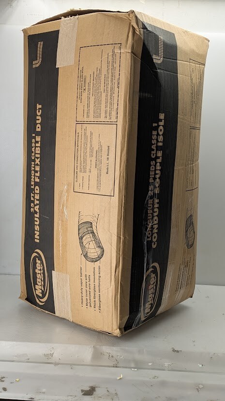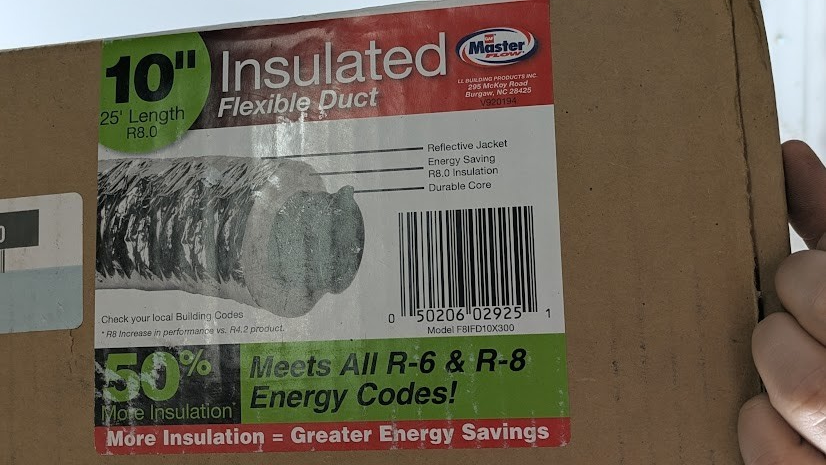 The Master Flow 10 in. x 25 ft. Insulated Flexible Duct R8 Silver Jacket is used in standard Heating and Air Conditioning (HVAC) systems and some venting applications. The duct has R8 insulation which contains 50% more insulation than the standard R4.2 product. This additional insulation provides greater thermal efficiency to save energy. The product is also covered in a heavy duty, silver jacket for durability. The duct is ETL listed, meeting the UL181 standard.