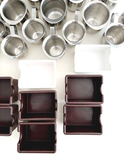 Some sew made in Japan, some sew stainless steel, sugar packet/jelly holders are plastic and made in Malaysia