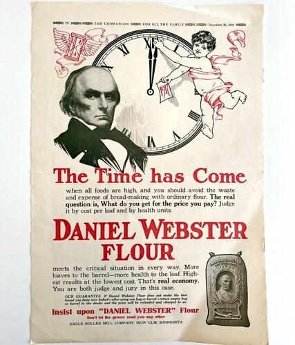 1916 Daniel Webster Flour Cherub Clock Advertisement Baking Ephemera 16 x 11"