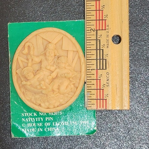 Vintage House of Lloyd Carved Christmas Nativity Pin Brooch 1995. Measures approximately: 2" X 1.75" X .50" - #542075 - New on package.
