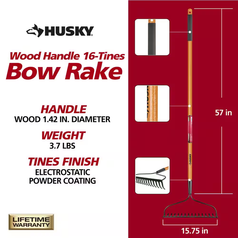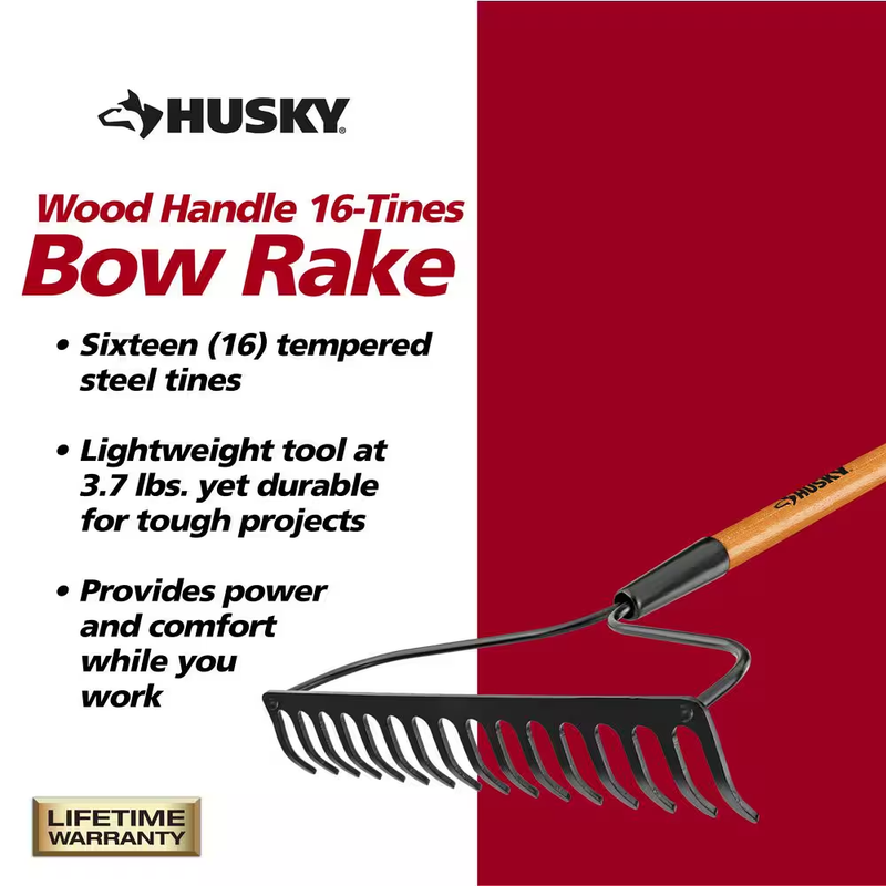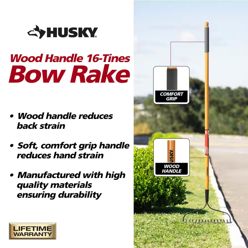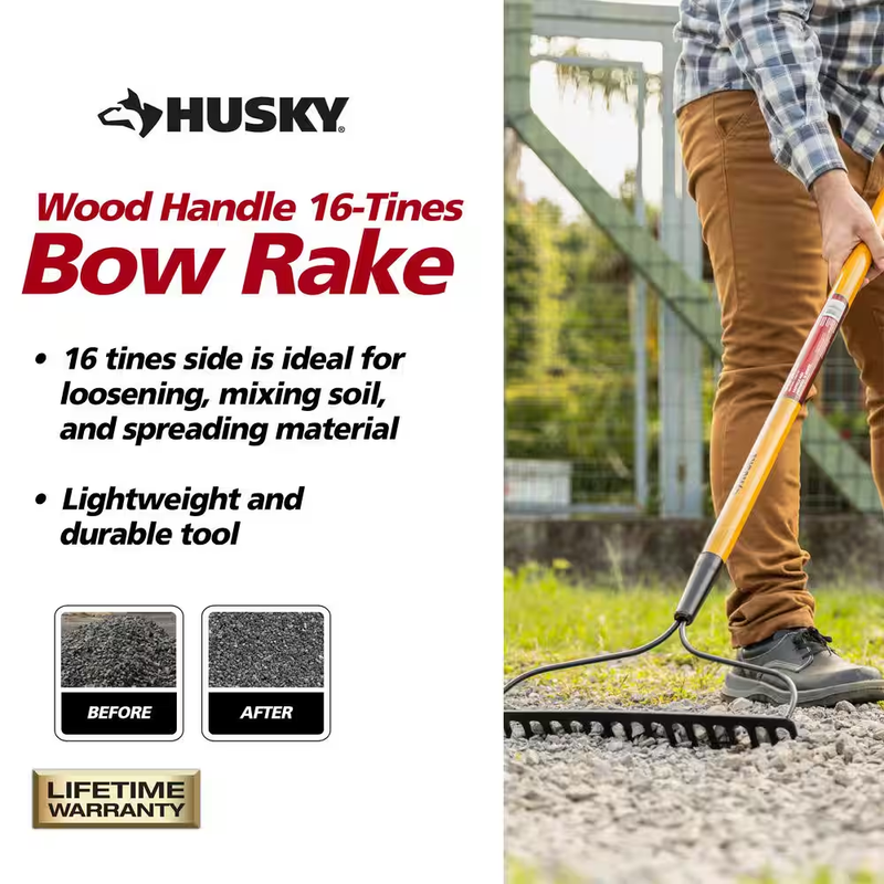 Efficiently loosen and level soil easily with the Husky 16-Tines Bow Rake with Eucalyptus Hardwood Handle. Designed with the practical gardener in mind, with its soft grip, you'll experience maximum comfort and control like never before.The secret to this rake's power lies in its full tempered steel blade, guaranteeing powerful soil loosening and leveling capabilities. No stubborn soil stands a chance against the strength and durability provided by the varnished hardwood handle.This remarkable bow rake is also equipped with an electrostatic powder coating that guarantees a long-lasting and reliable gardening tool that will serve you well for years to come.Ideal for breaking up and aerating compact soil, spreading mulch, and leveling ground, this versatile and durable choice will meet all of your gardening needs with ease. Choose the Husky 16-Tines Bow Rake with Eucalyptus Hardwood Handle and experience the true joy of effortless gardening.