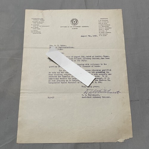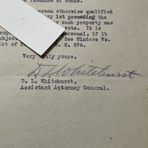 Old Letter Attorney General Office Austin Texas 1929 Signed D. L. Whitehurst