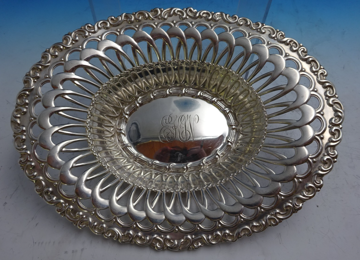 Remarkable Louis XV by Whiting-Gorham sterling silver pierced bread basket marked #3869. This piece measures 10 1/4" x 8" and weighs 7.6 troy ounces. It is monogrammed (see photos), and is in good estate condition as shown. Terrific!