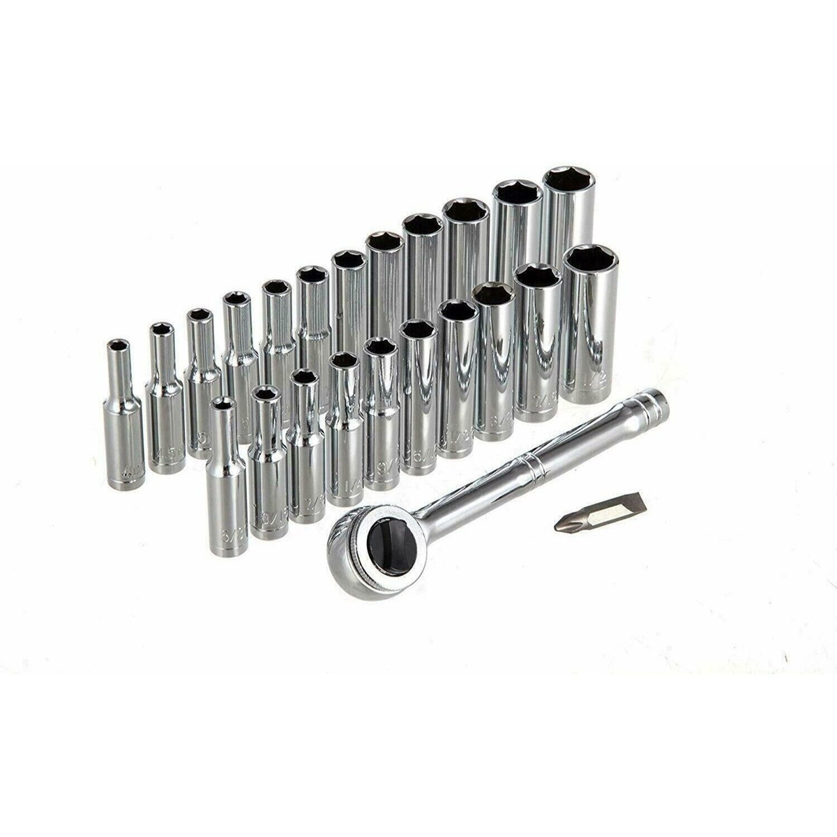 Hyper Tough 24 Piece 1/4 Inch Drive Deep Socket Bit Set with Ratchet Handle.