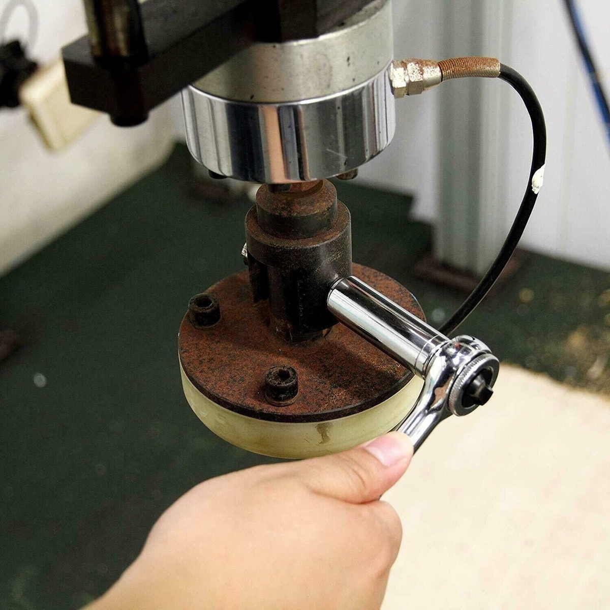 The ratchet handle has a 36-tooth gearing and a thumb screw for threading a nut or bolt.