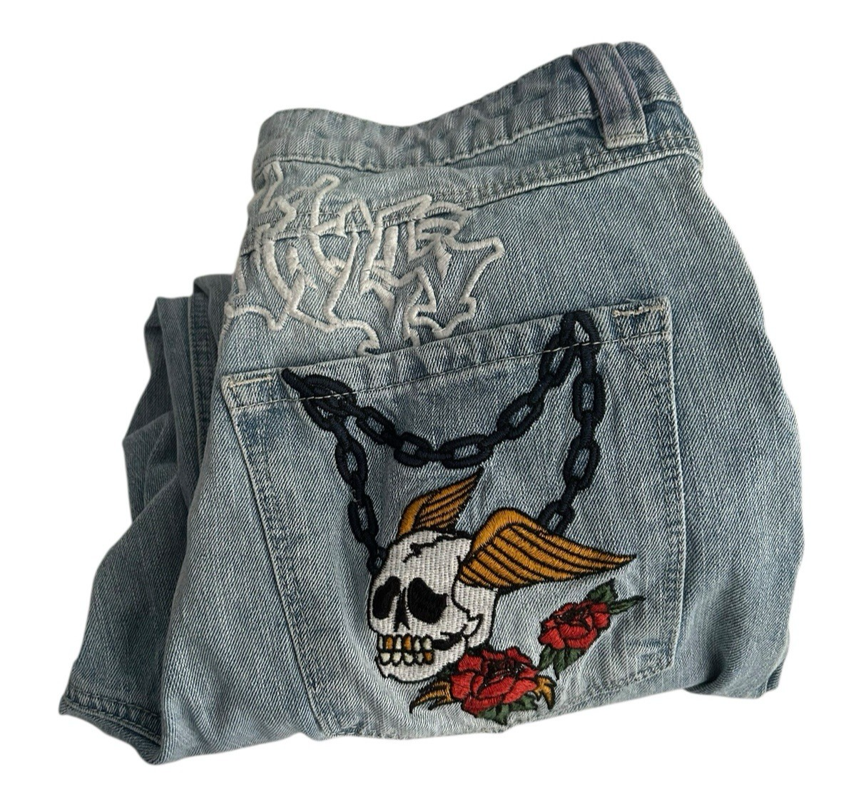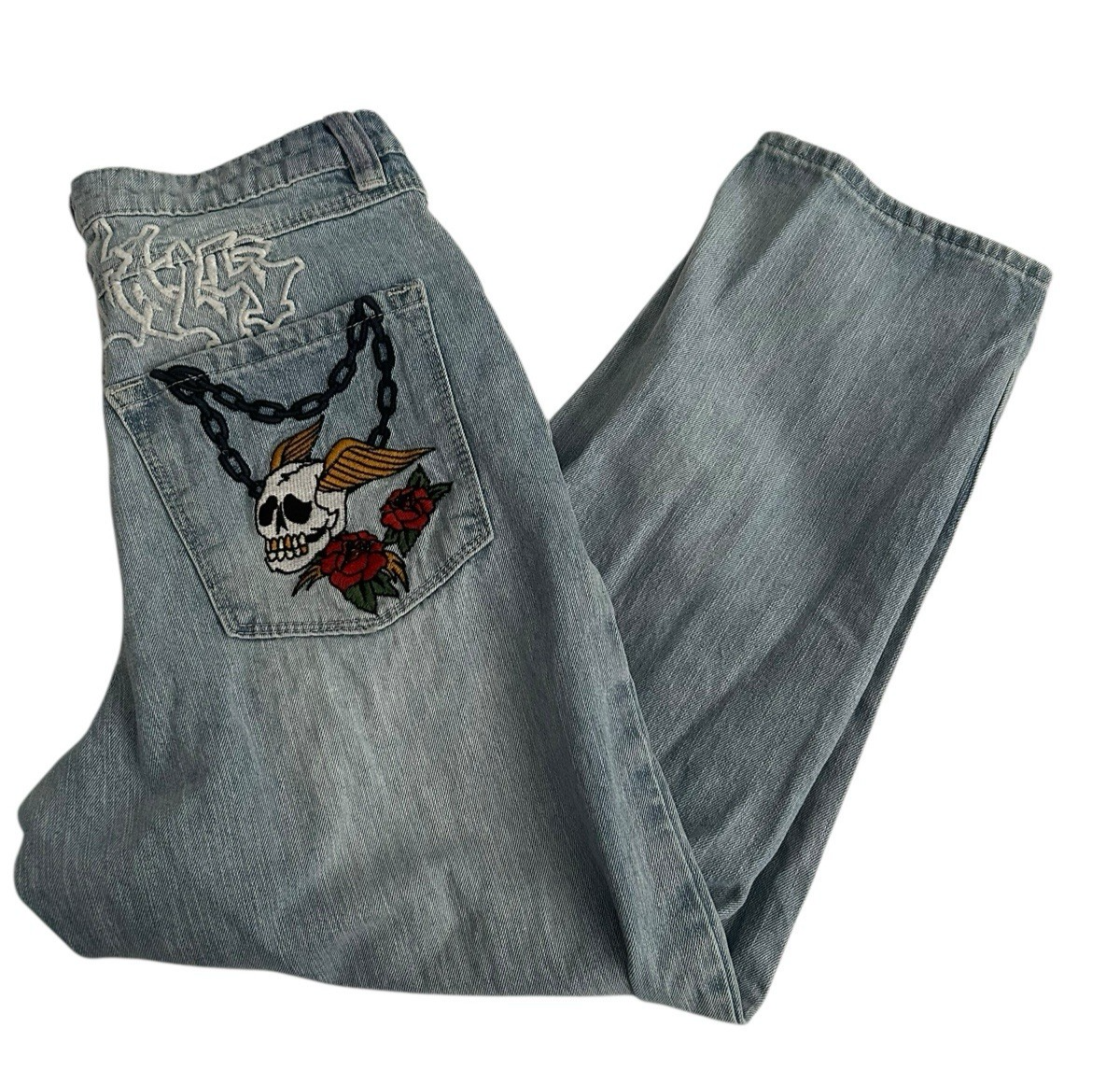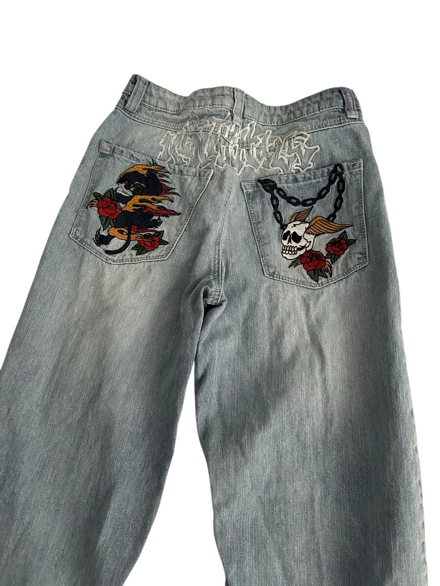 The Y2K Ninth Hall Ambush Jeans are a stylish and trendy addition to any man's wardrobe. These wide-leg skater jeans in a vibrant blue color feature an embroidered skull design and dragon on each one of the back pockets, adding a unique touch to the overall look. Made of classic denim cotton fabric, these light wash jeans have a regular fit and are machine washable for easy care. The zip and button closure, along with the 5-pocket design, ensure both functionality and style in these bold and eye-catching jeans from the Ninth Hall brand.
