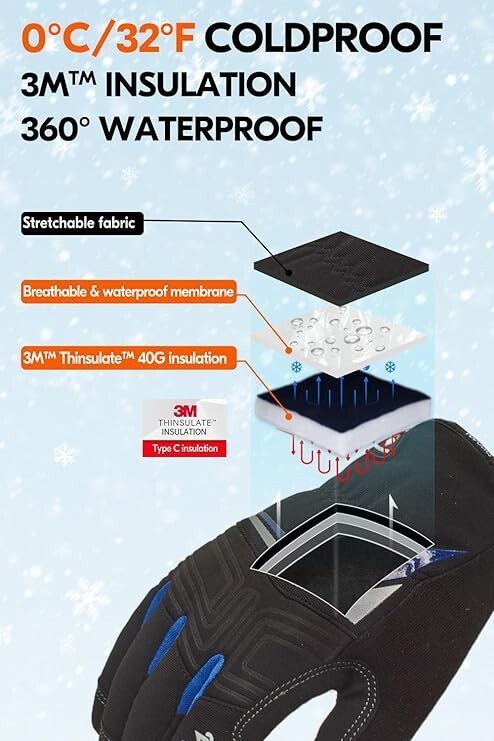 ?WATERPROOF TPU LINING COLDPROOF THINSULATE C40(-20F)?Newly added waterproof TPU membrane blocks rain/snow, while Thinsulate C40 insulation traps body heat for extreme cold protection during freezer warehouse operations, icy construction sites, or snow removal duties.