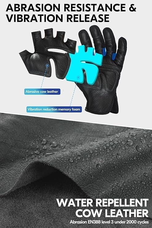 ?VIBRATION REDUCTION ABRASION RESISTANCE?High dexterity foam padding offering vibration resistance. Durable cow leather Palm for abrasion reaching EN388 level 3 under 2000 circles.