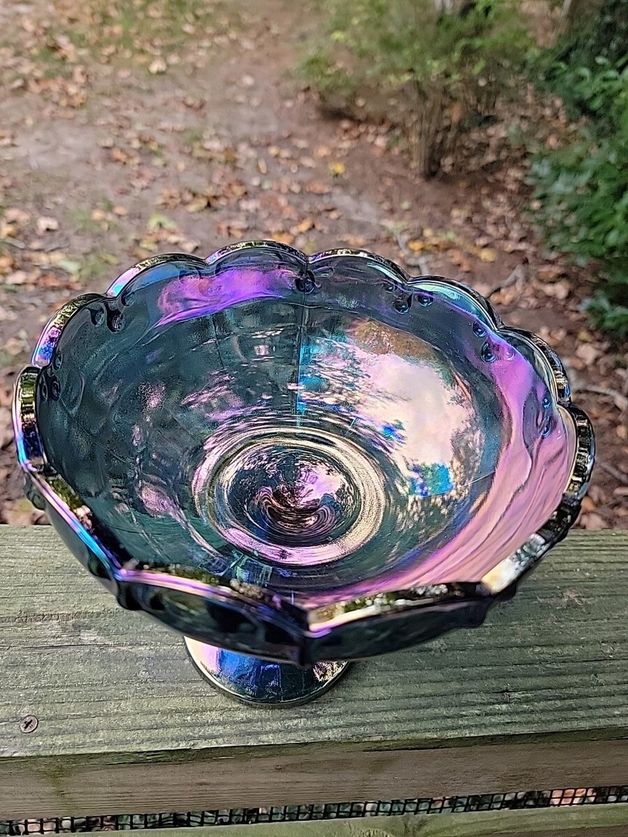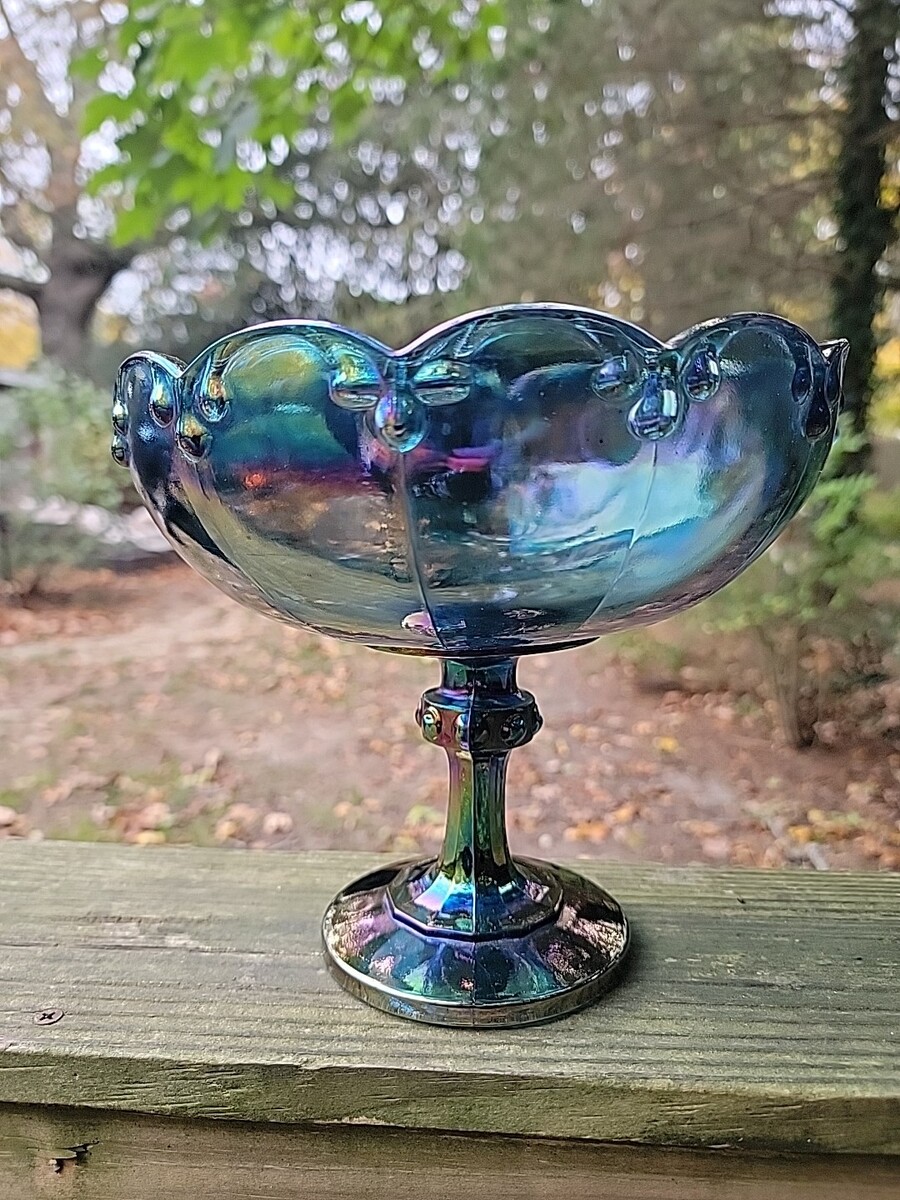 Indiana Blue Iridescent Carnival Glass Compote Fruit Pedestal Bowl ~ Vintage