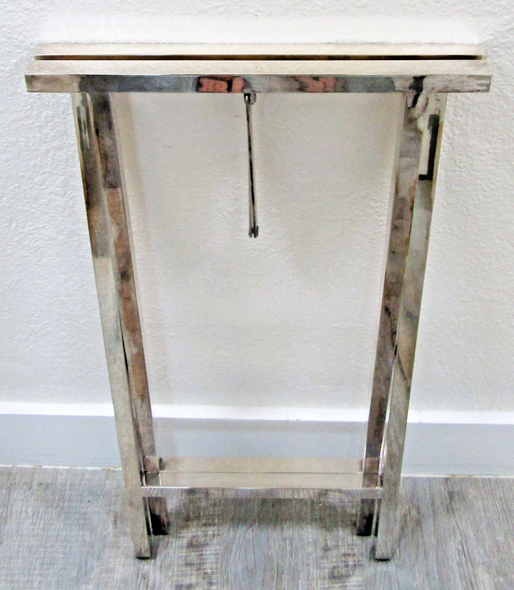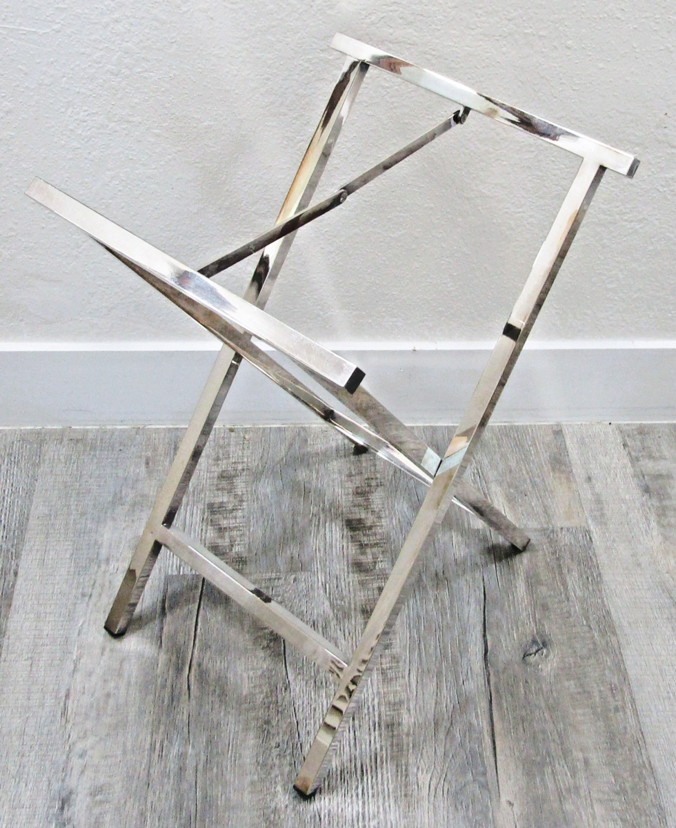 This elegant 1970s Chrome Campaign Folding Table Base is a fully assembled antique piece with a sleek silver color and a classic rectangular shape. Made of chrome material, this original American-style folding table base is perfect for indoor use in any room. With a foldable design and a post-1950 time period manufactured, this table base is a stylish and functional addition to any home decor. The chrome finish and handle material add a touch of sophistication, making it a versatile and timeless piece of furniture. You can add a tray or a table top. It could also be used as a luggage rack.