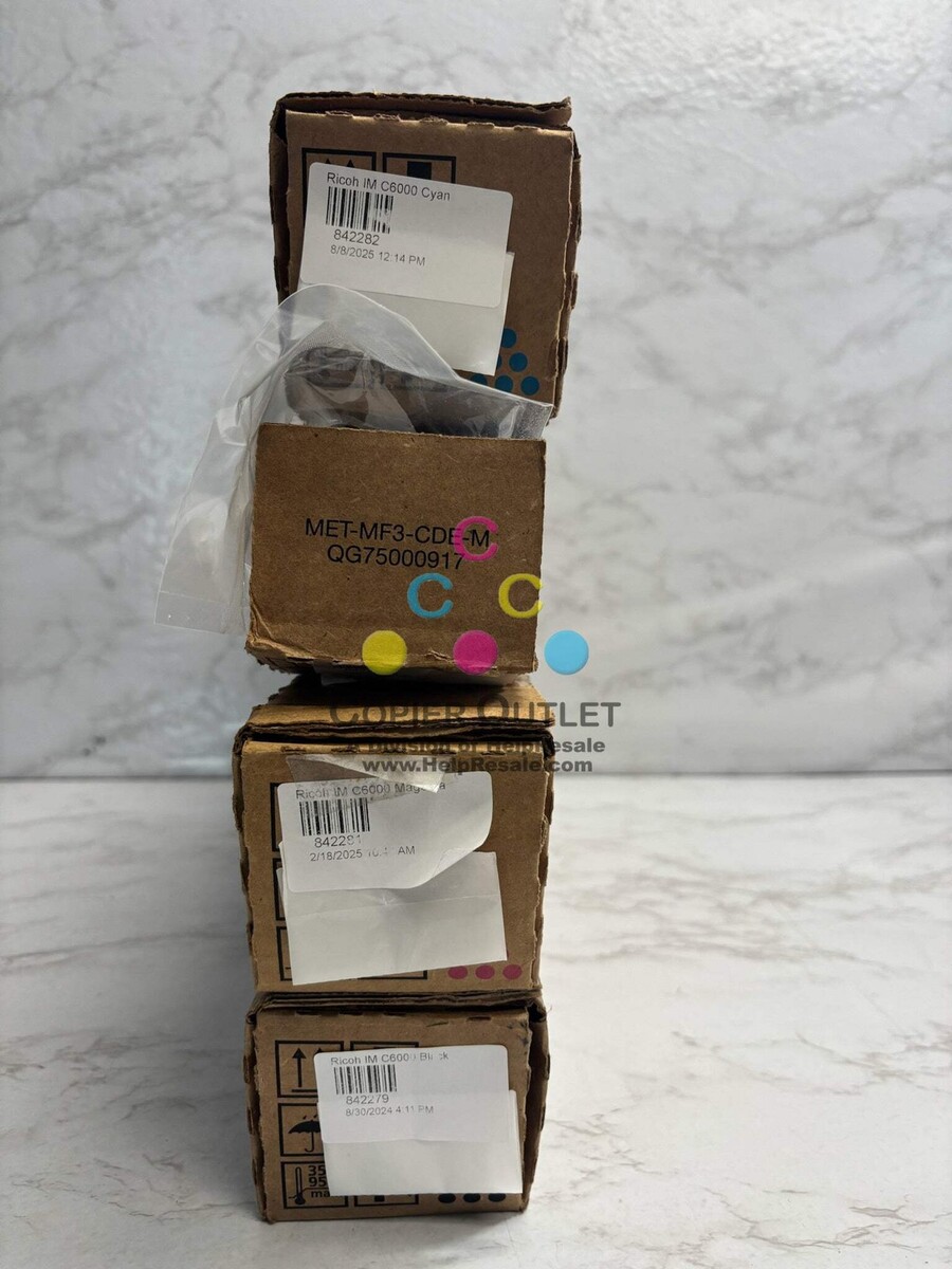 Lot of 4 Open Genuine Ricoh 842282, 842281, 842279 Cyan, Magenta Black Toners (No Yellow) New - Open Box and Open Seal ***Please See Reference Photos*** Same Day Shipping For Ricoh Savin Lanier IM C4500, C6000 Listed By: Renee (Sales Team)?Liberty means responsibility. That is why most people dread it.?~George Bernard Shaw(A positive moment brought to you by Help Resale) Copier Outlet (A Division of Help Resale) Copier Outlet was established in 1993. We buy and sell both domestically and internationally and have wide assortment of copiers, consumable and accessories of all popular brands. All of our copiers are in house and available for your inspection. They all have been tested and rated for functions, cosmetics and overall appearance. Our consumable and accessories selections include toners, imaging units, developers and copier parts such as fax board, fixing unit, fuser unit, roller, cleaning brush, drum blades and etc. For more detailed information on our copiers, consumables and accessories, please feel free to give us a call. We are more than happy to assist you with the pricing and guide you to find the copiers, consumable and accessories you wish to buy. Best Regards, Copier Outlet Sales Team Monday - Friday: 9:00 am to 5:00 pm (PST) Copier Clearance Center Promo Video - YouTube Video will open in a new windowUsing the App? Paste link into a browser window: [isdntekvideo] All product and company names are trademarksTM or registered trademarks of their respective holders. Use of them does not imply any affiliation with or endorsement by them.
