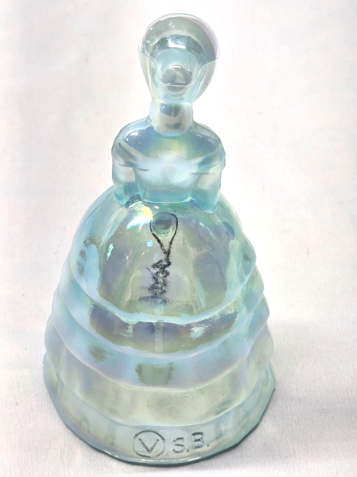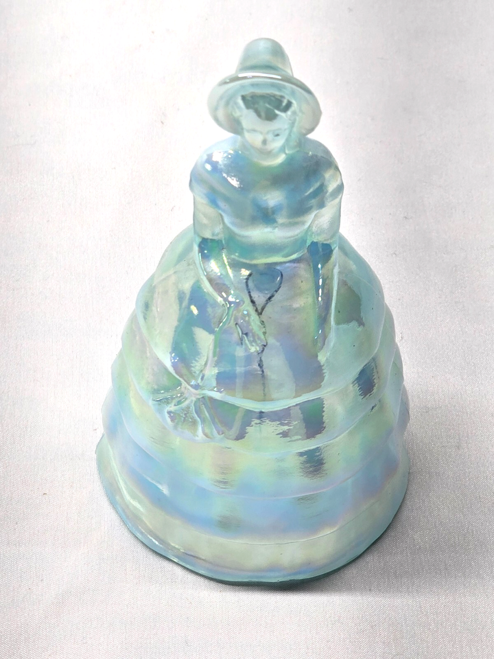 Beautiful Melanie Southern Belle figurine by Summit Art Glass. Bell is in excellent condition, has great color and no wear or damage. Measures 5" and is 2.75" in diameter at the base. I don't know the exact pattern name or if it even has one, but the color is sort of a blue iridescent carnival style glass.