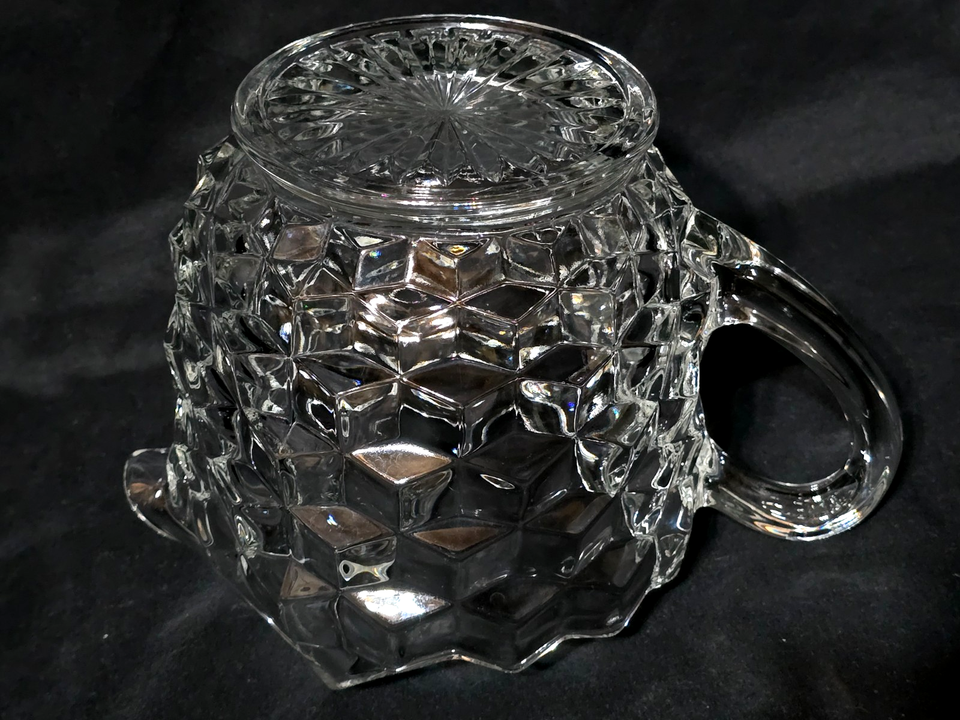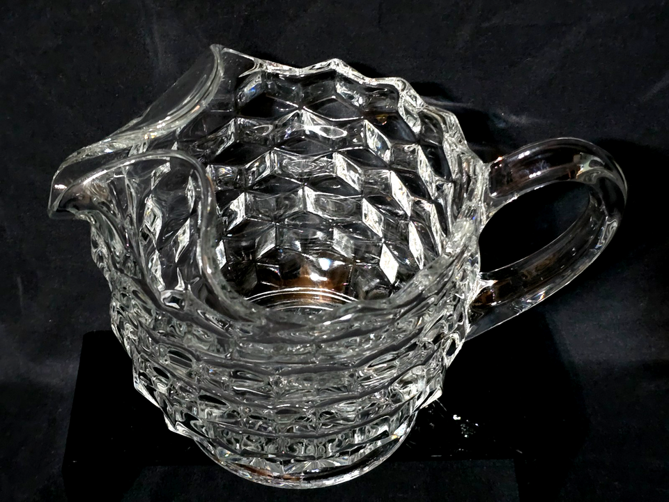 Lovely vintage Fostoria American clear glass pitcher the classic cube pattern. Has very bright clarity and the signature sparkling texture Fostoria is known for. Pitcher is in excellent vintage condition with no chips, cracks, or cloudiness. Perfect for entertaining, display, or completing your Fostoria American collection.