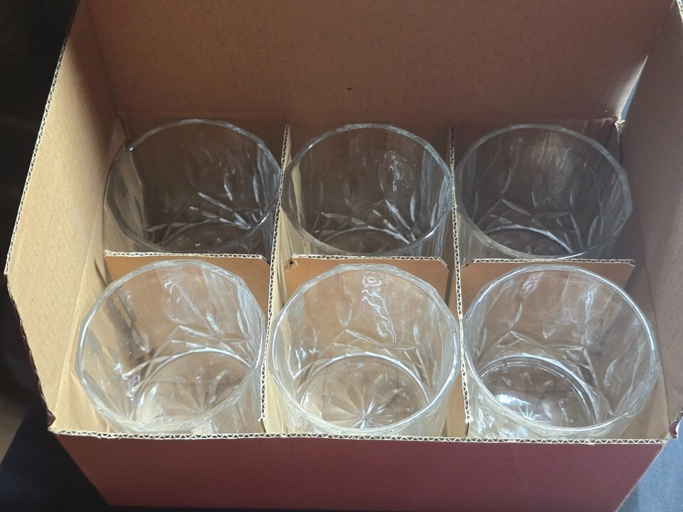 no evidence of damage or wear. Set consists of decanter, stopper and 6 old fashioned / rocks glasses. Item has only been removed from the box once for damage inspection and photo purposes for this listing. Decanter holds 28 ounces, or a full "fifth". The glasses are 8 ounces each.