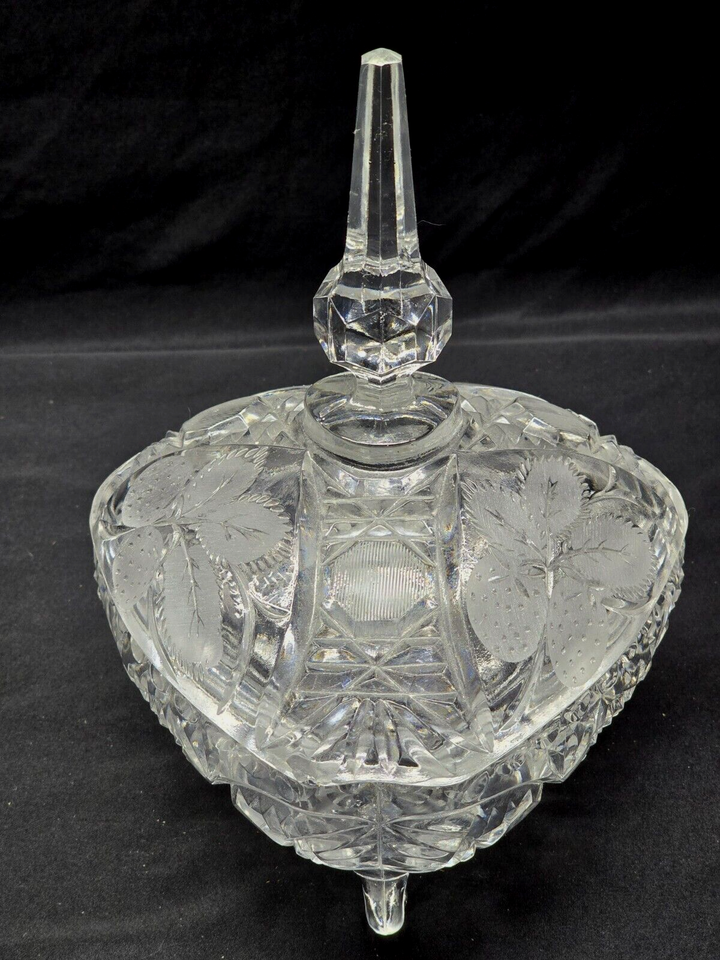 Vintage Cut Crystal Covered Candy Dish With Etched Strawberries & Vine Pattern
