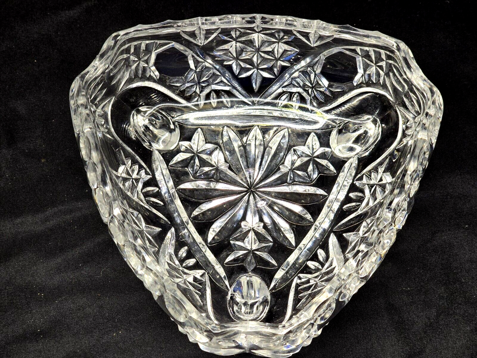 Beautiful lead crystal footed candy dish in excellent condition, no damage and only very minor wear, if any. Dish is triangular and measures approximately 7" point to point. The cover is decorated with what looks to be etched strawberries. Overall height to the top of the finial is about 9.5". Age and maker is currently unknown, but with over 20 years experience dealing in glassware, my best guess is European origin, circa 1930s-1940s.