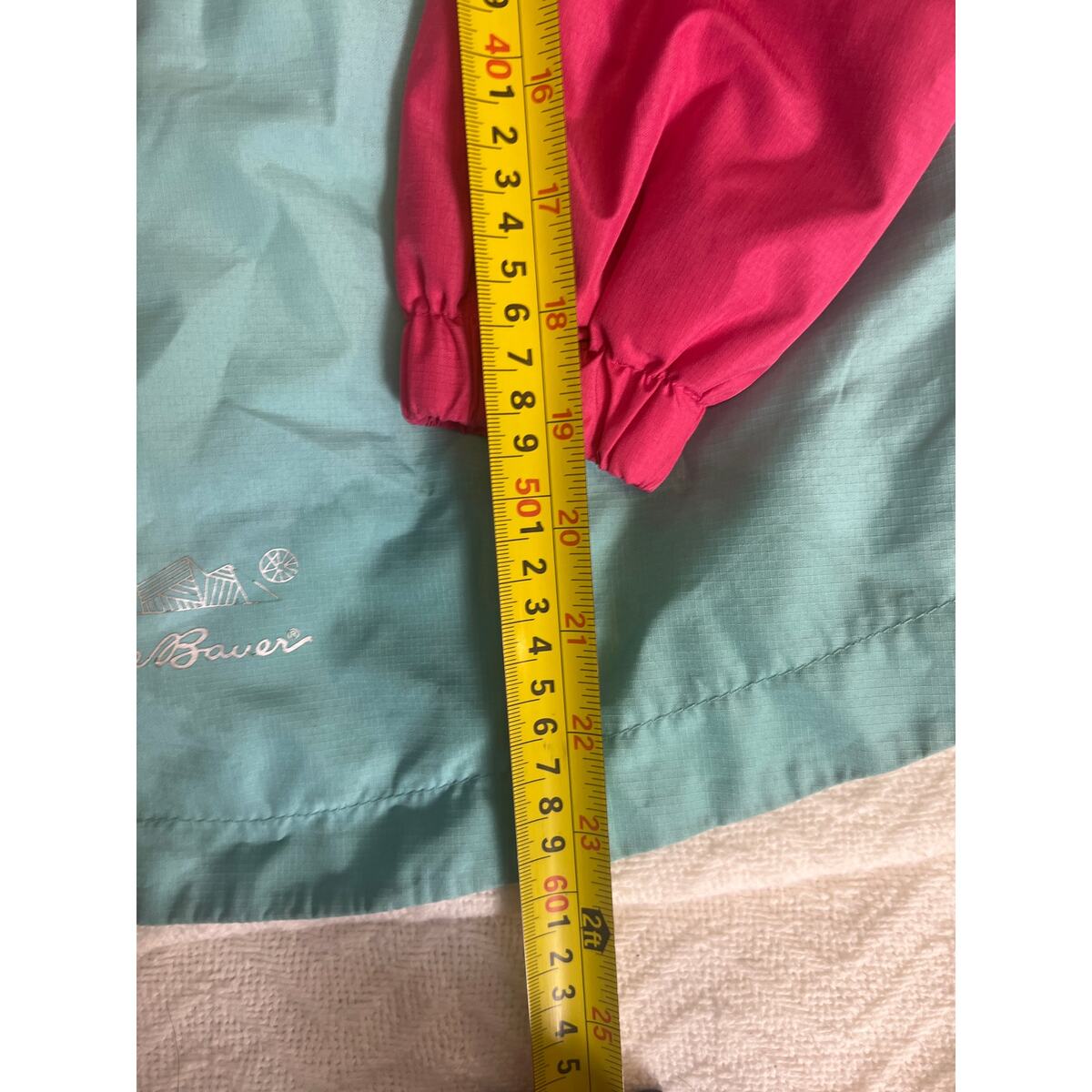Lightweight Eddie Bauer windbreaker in pink and aqua colorblock design. Features zip front, hood, and elastic cuffs for a comfortable fit. Perfect for outdoor play, travel, or layering. Durable nylon shell with soft interior lining.