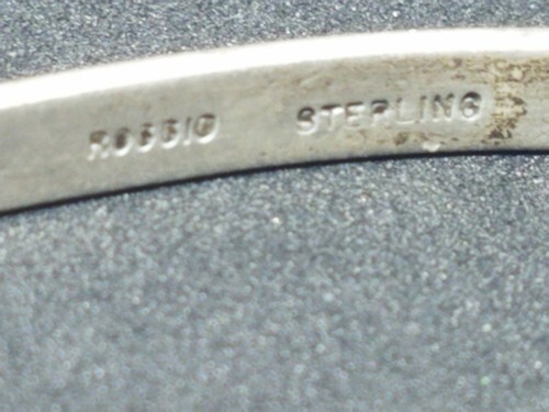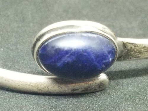 Zum Verkauf steht ein gebrauchter Vintage-Armreif von Susan Roggio aus 925er Sterlingsilber mit blauem Stein. Das Armband hat einen Durchmesser von 2,5 Zoll und passt an ein Handgelenk von 7 Zoll. Vorfalldaten