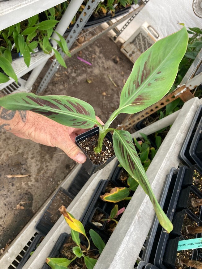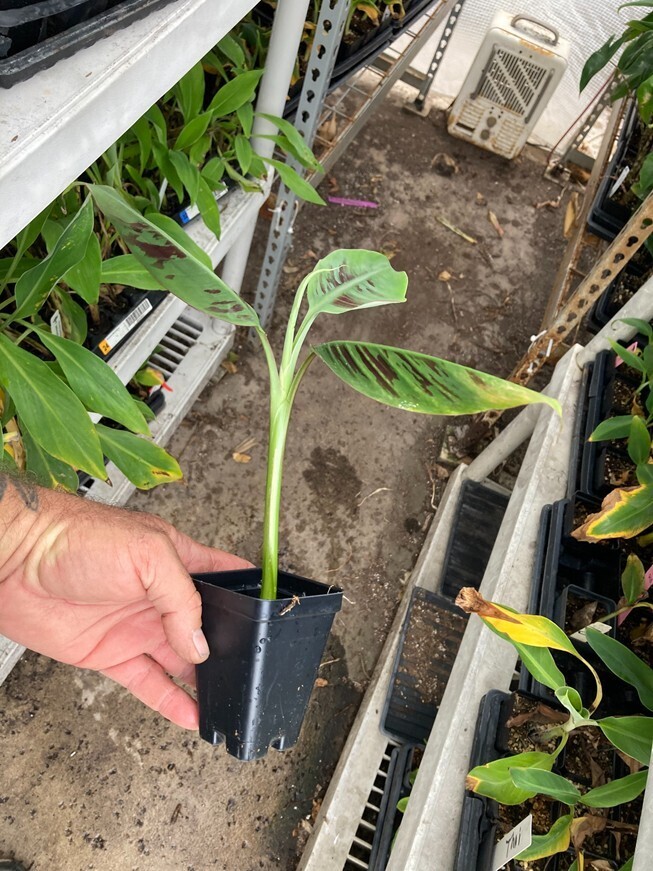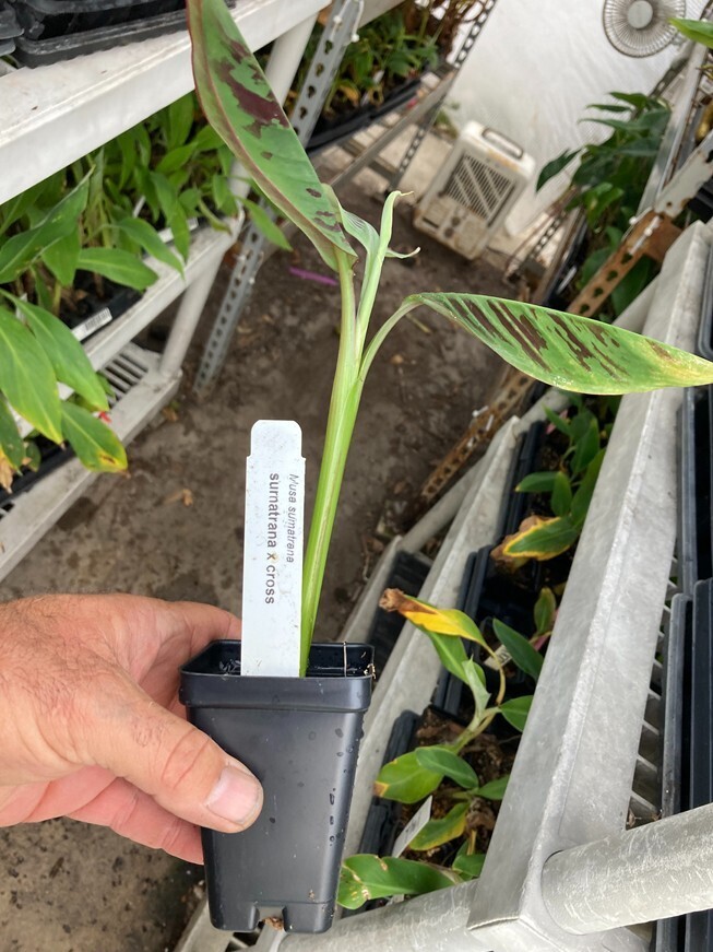 Musa sumatrana cross (Zebrina x Gran Nain) is a cross between Sumatrana Zebrina, (from which the colored leaves are derived) and Gran Nain(aka Chiquita), which is an edible banana ? giving an banana plant with striking foliage and edible fruit.