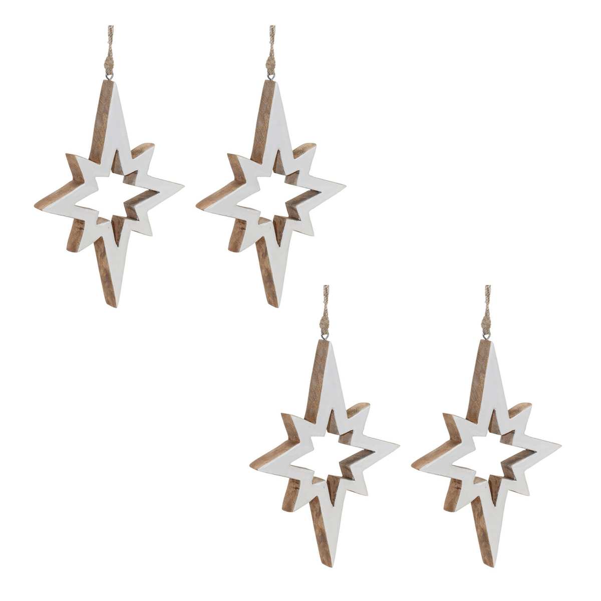 Enhance your holiday decor with this charming Set of Wood Star Cut-Out Ornaments. Crafted from solid wood with a wintry white finish, these rustic North Star decorations bring a touch of woodland elegance to your Christmas tree. Each ornament features a natural wood grain accent and an attached jute string hanger for easy placement. Measuring 10 inches in height, they are ideal for both residential and commercial displays. Whether adorning your own tree or gifted to a loved one, these timeless wooden ornaments will spread holiday cheer for seasons to come! Sold in a set of four matching pieces to create a balanced display on your Christmas tree.