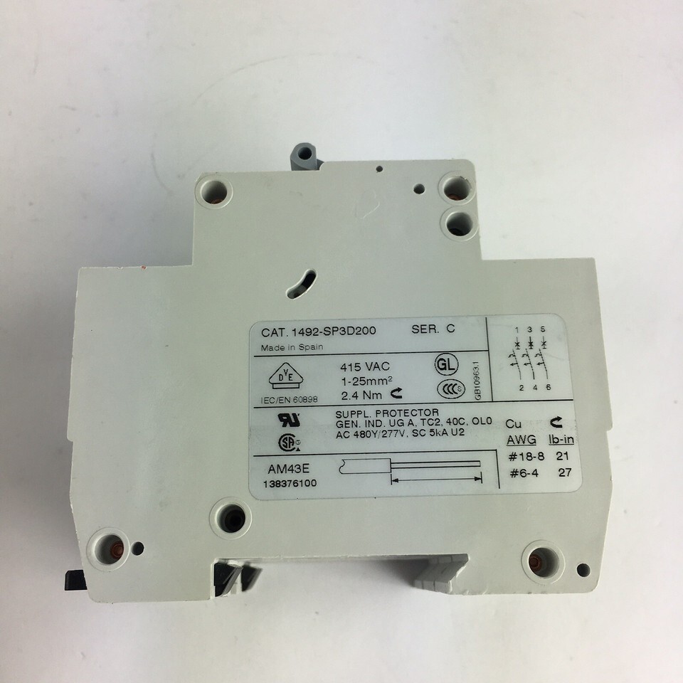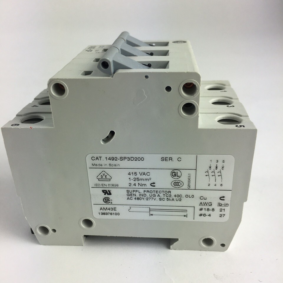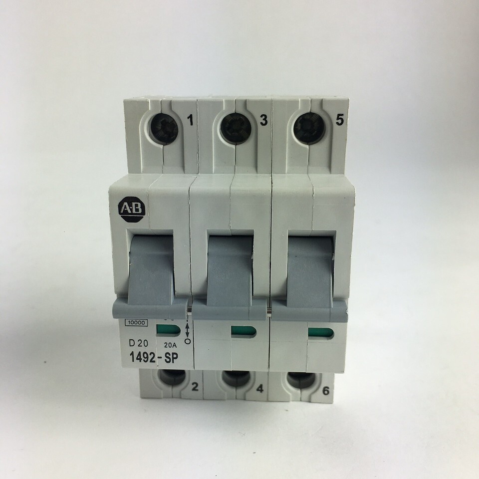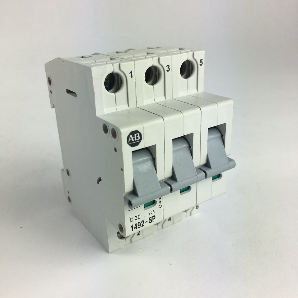 Allen Bradley 1492-SP3D200 Breaker, Miniature, 20A, 3P, 480Y/277VAC Mfg: Allen Bradley Model: 1492-SP3D200 Type: Miniature Breaker Trip Curve: Type D Load Rating: 20A Current Rating: 480Y/277VAC Poles: 3 Mounting: DIN Rail Supplementary, Highly Inductive ---acquired from R amp;D project that was never executed - parts are new
