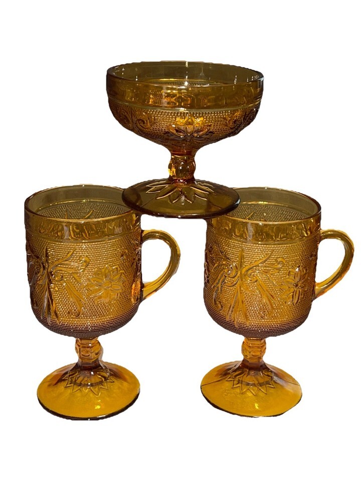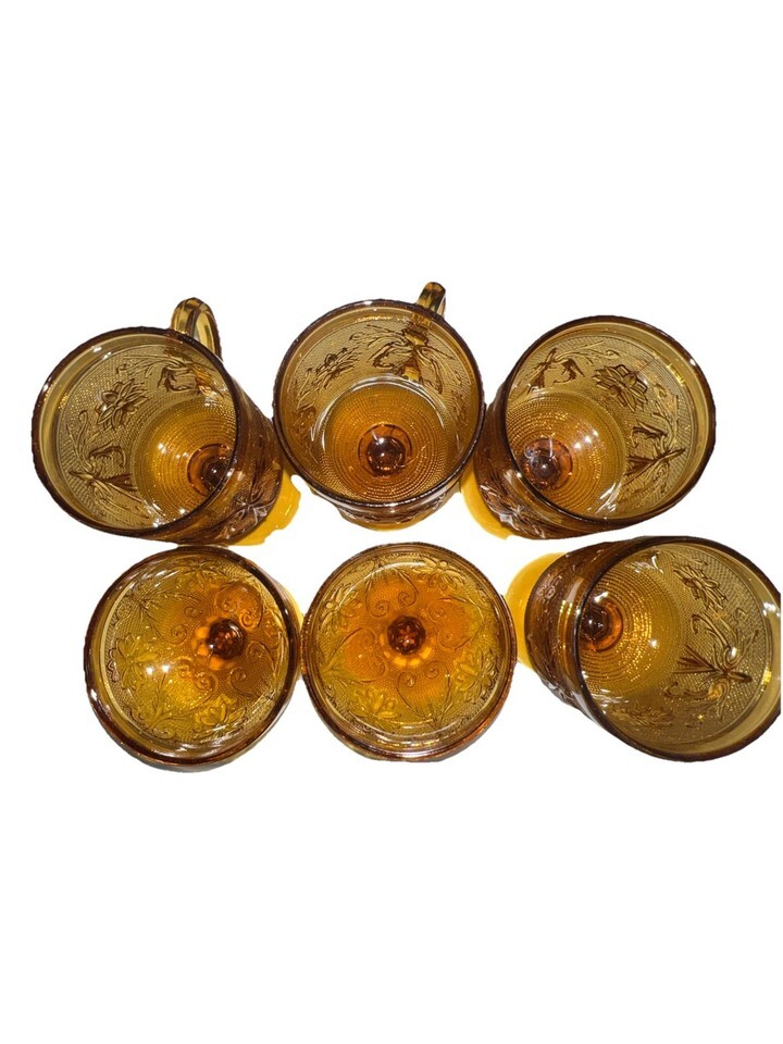 Set Of 6 Tiara Indiana Glass Amber Sandwich 8 oz Footed Cups Mugs Dessert Bowls