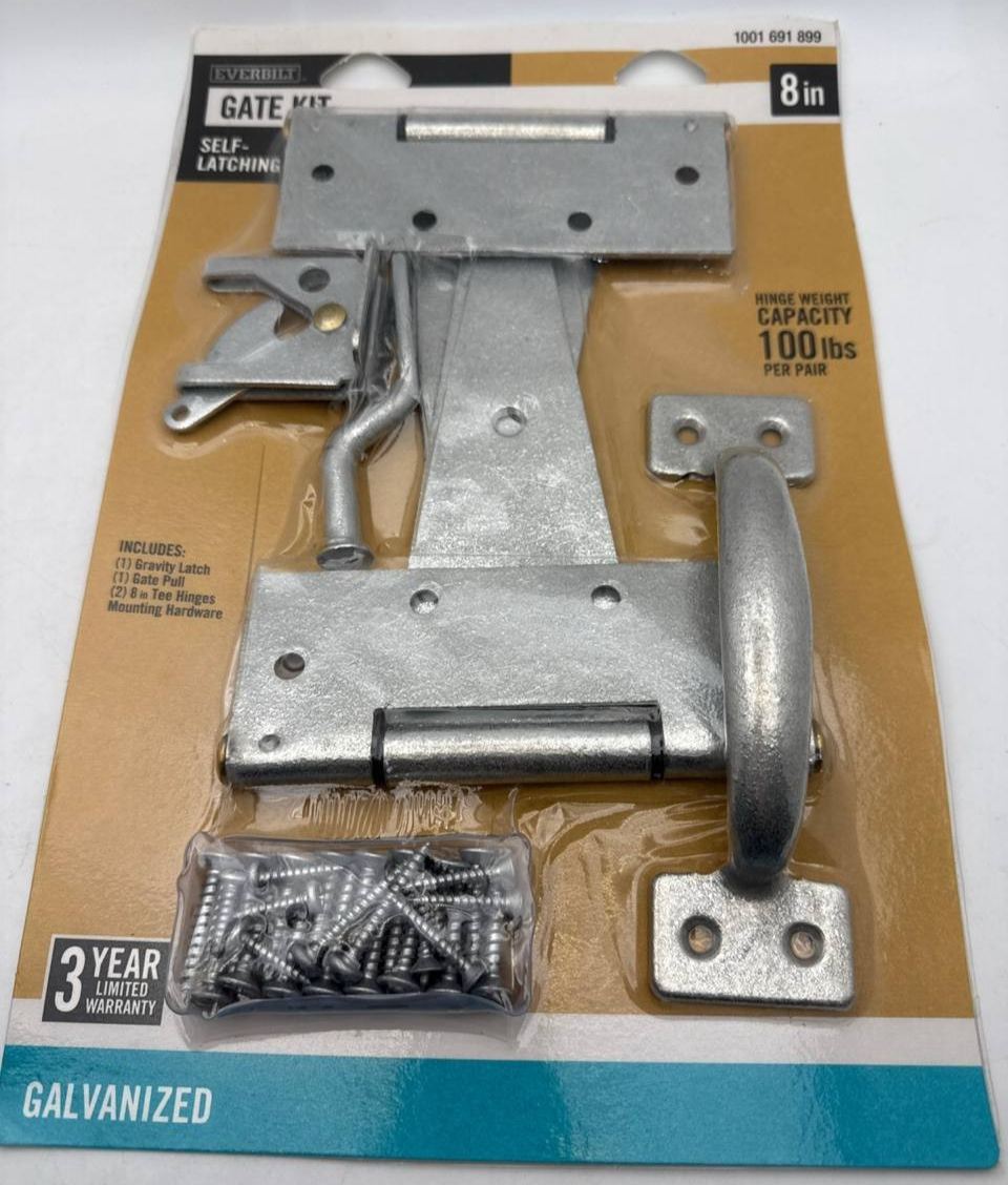 ?Kit includes two 8-in tee hinges, one gate latch and one pull handle, providing all major hardware components for a standard gate installation.