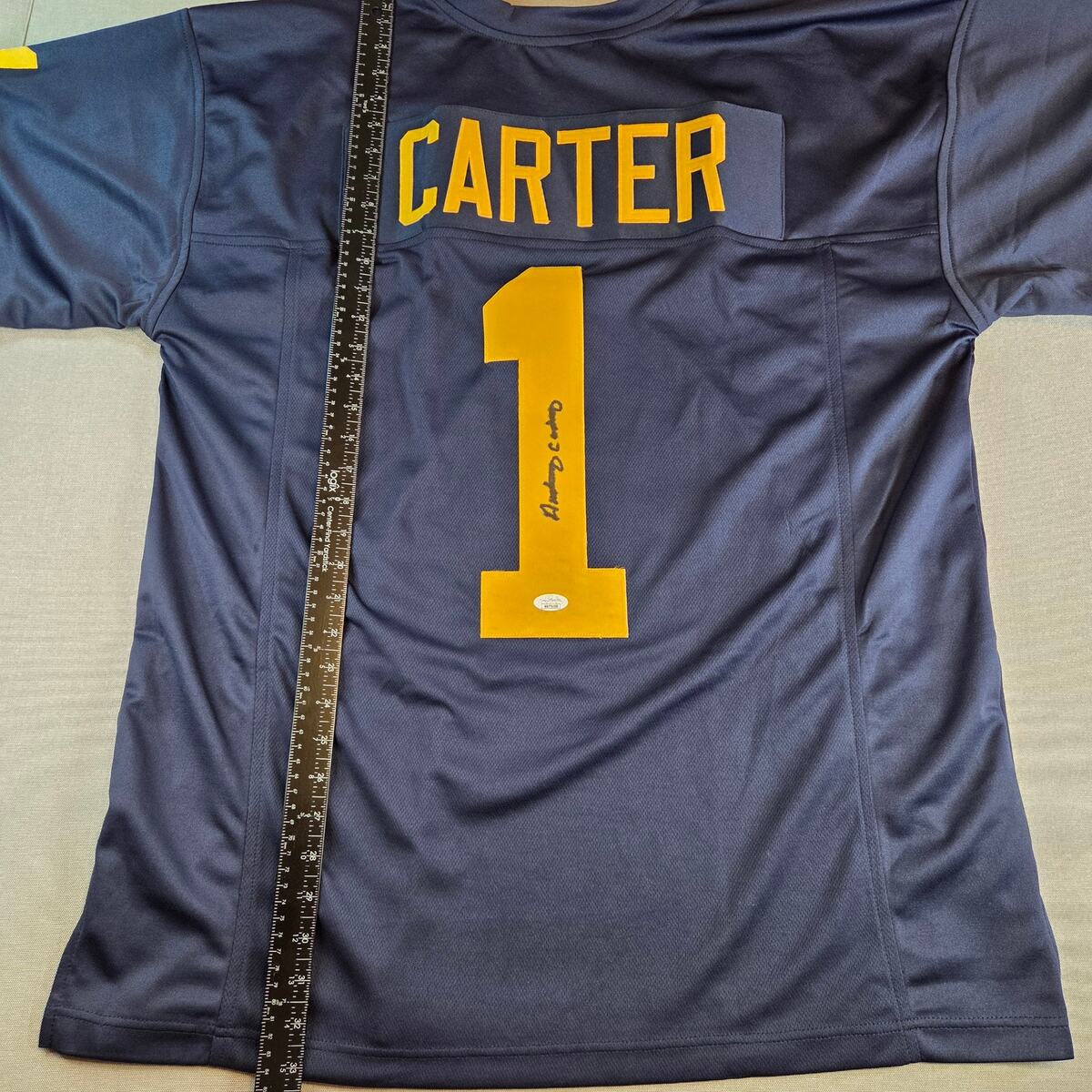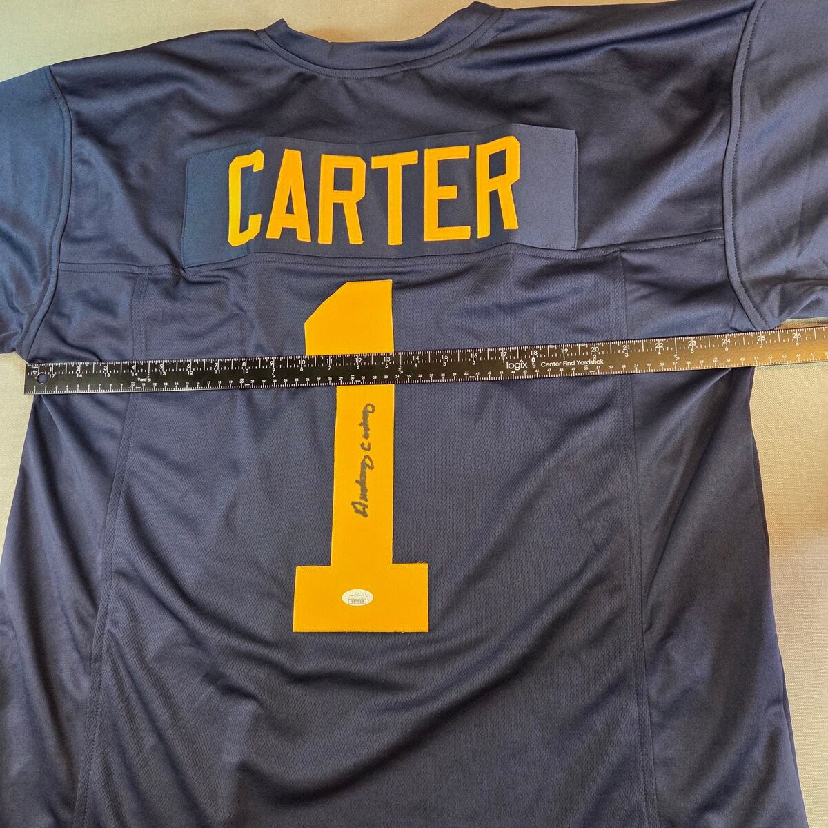 Custom (non-licensed) #1 jersey in Michigan colors, hand-signed by Anthony Carter and authenticated by JSA. Includes matching hologram and certification card shown in photos. Tagged XL; ideal for framing or display rather than wear.