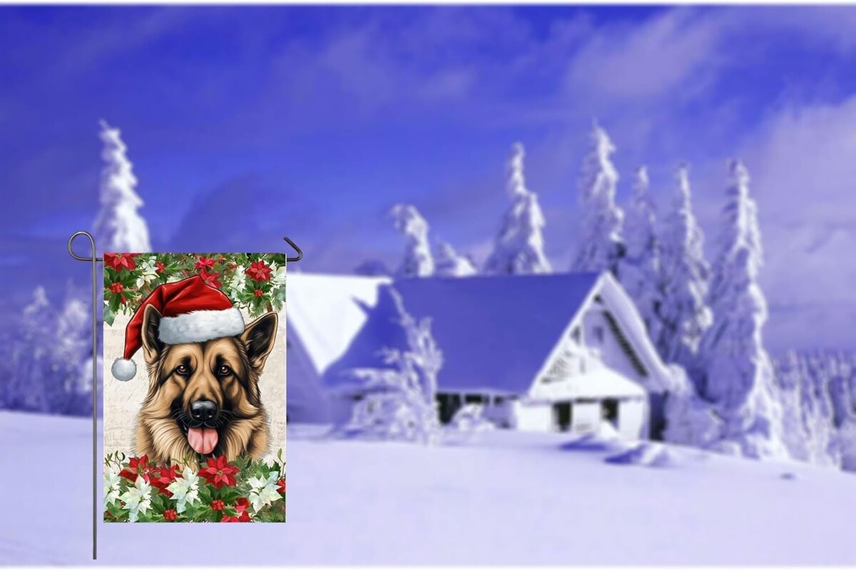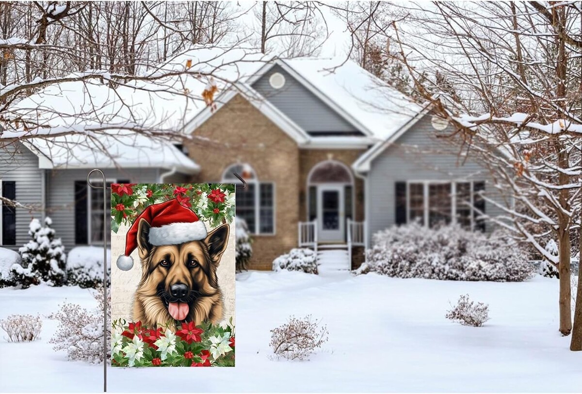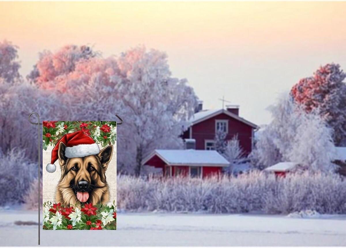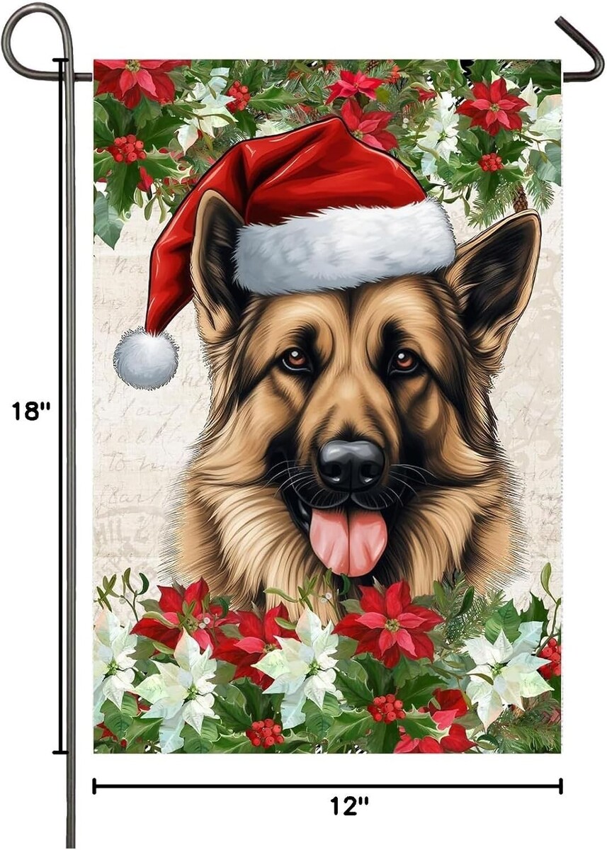 : Decorative garden flag is a good choice for home decor and adds a strong seasonal atmosphere. This christmas garden flag features a german shepherd dog wearing a christmas hat and poinsettia flowers on both sides. Perfect for adding color and beauty to your outdoor garden, yard, patio, front porch, farmhouse decor.